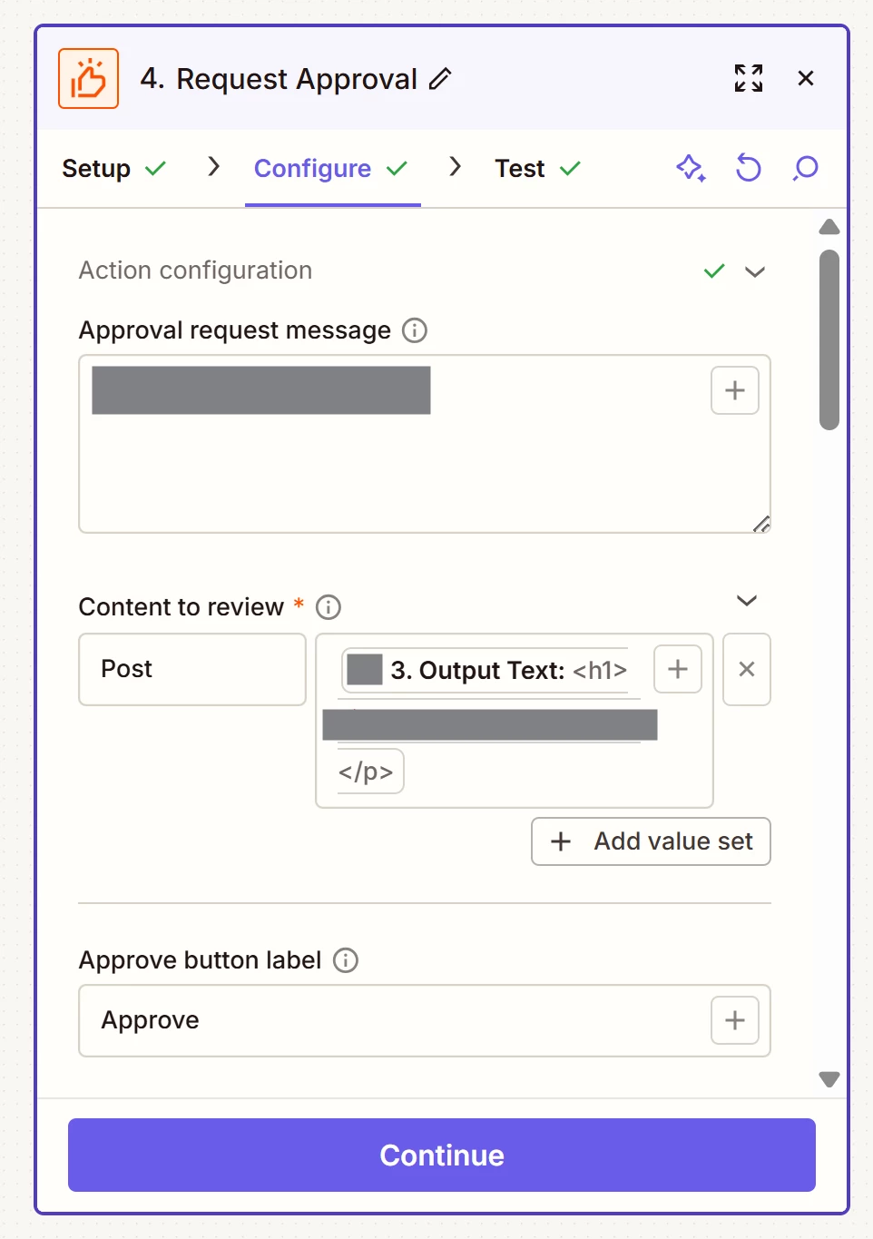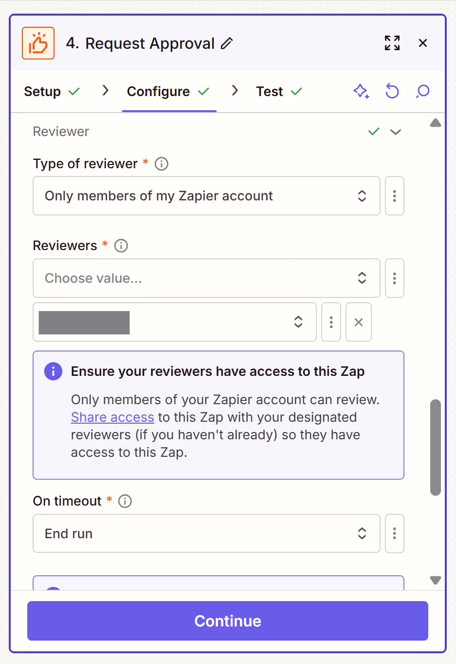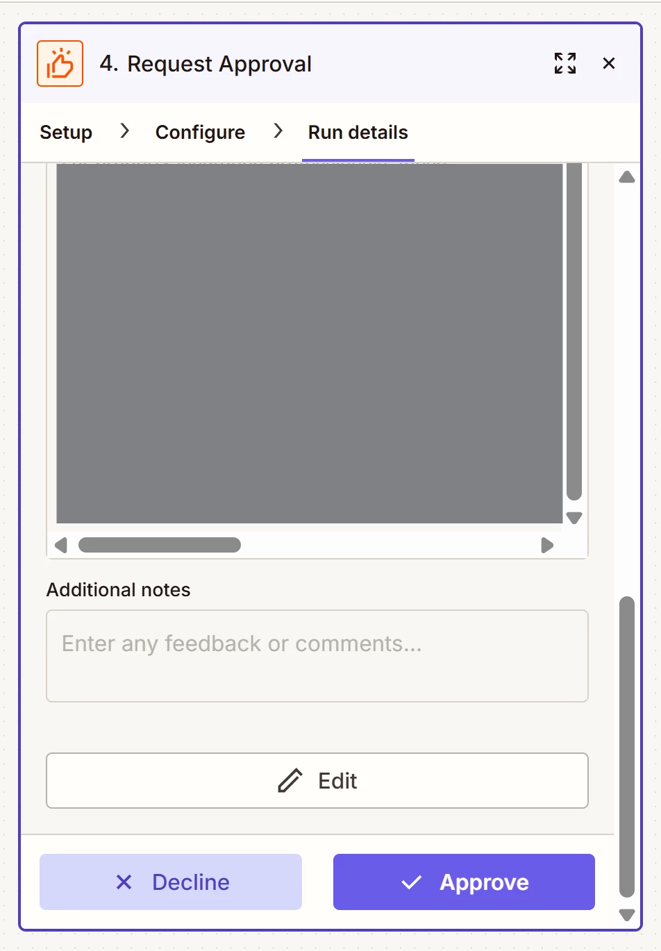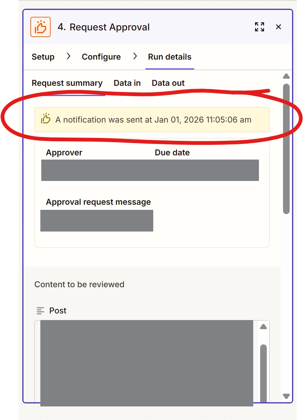 In the actual workflow, it just asks me to manually approve it. It also says “A notification was sent...”, but it wasn’t sent to Slack, evidenced by not seeing any messages from Zapier, and I got the failure email about it from Zapier: