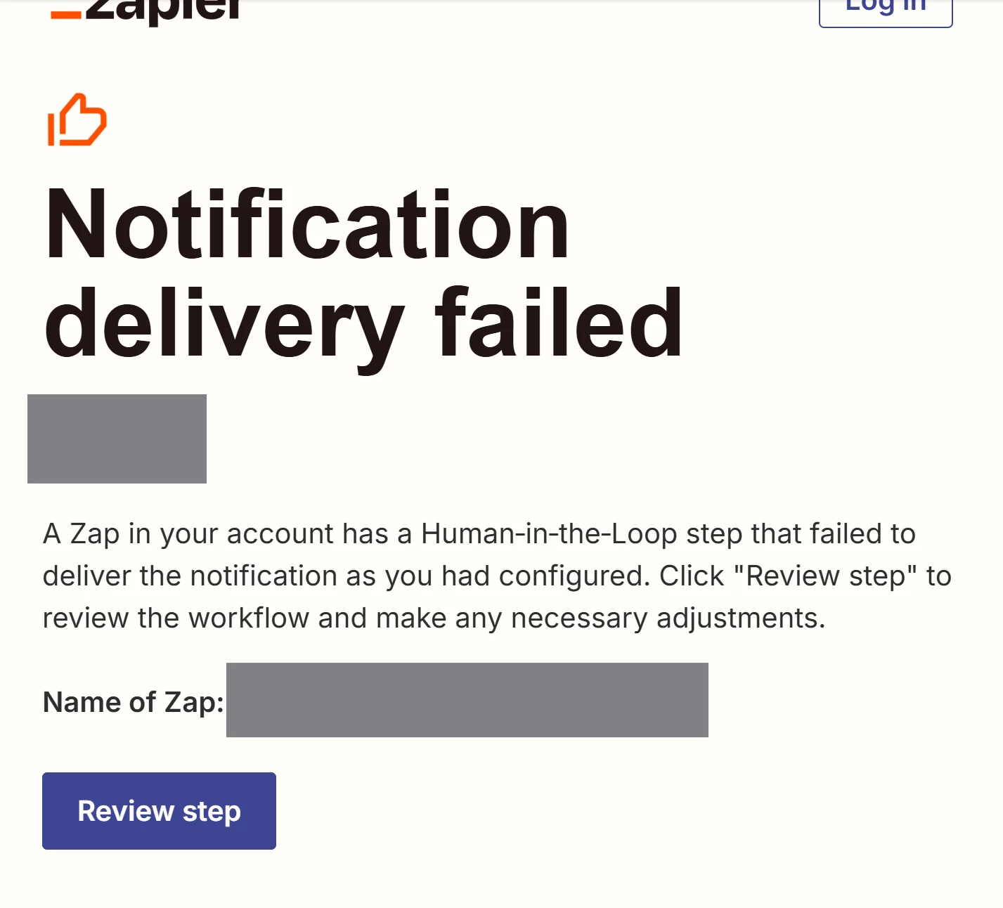 “A Zap in your account has a Human‑in‑the‑Loop step that failed to deliver the notification as you had configured. Click "Review step" to review the workflow and make any necessary adjustments.”