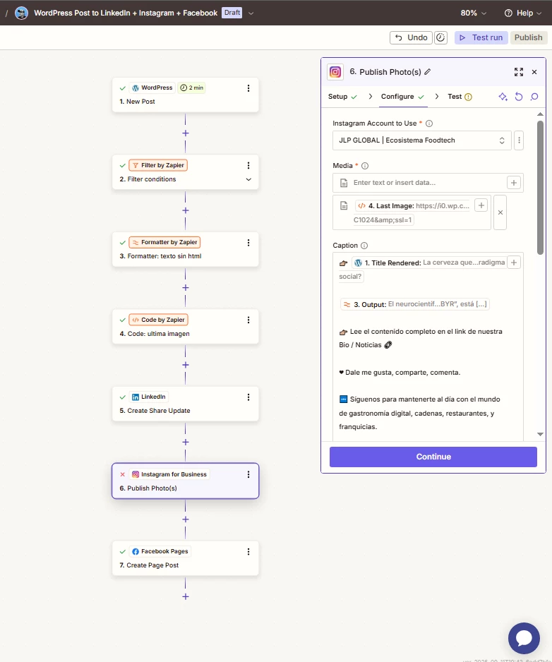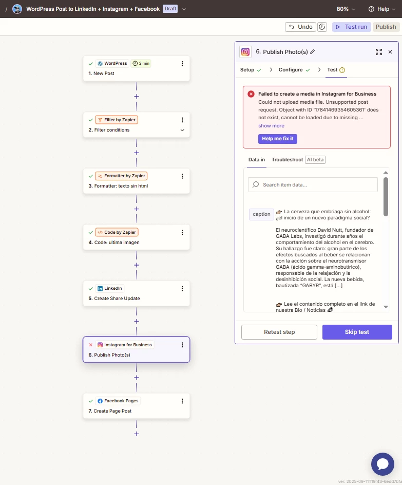 I’ve been running a Zap that publishes content from WordPress to LinkedIn, Instagram for Business, and Facebook Pages. This Zap has been working fine for months, but as of a few days ago, the Instagram for Business step started failing with the following error: