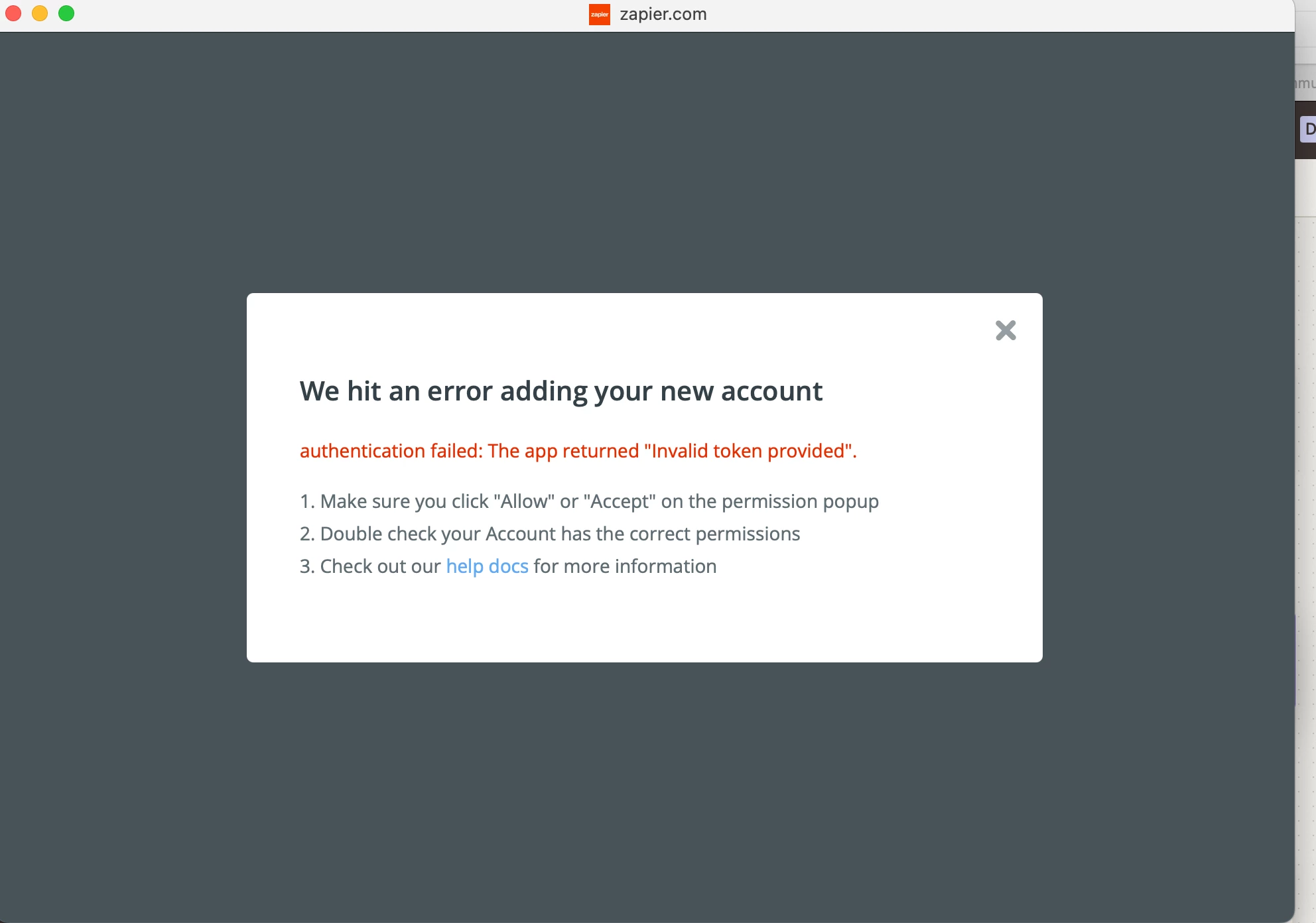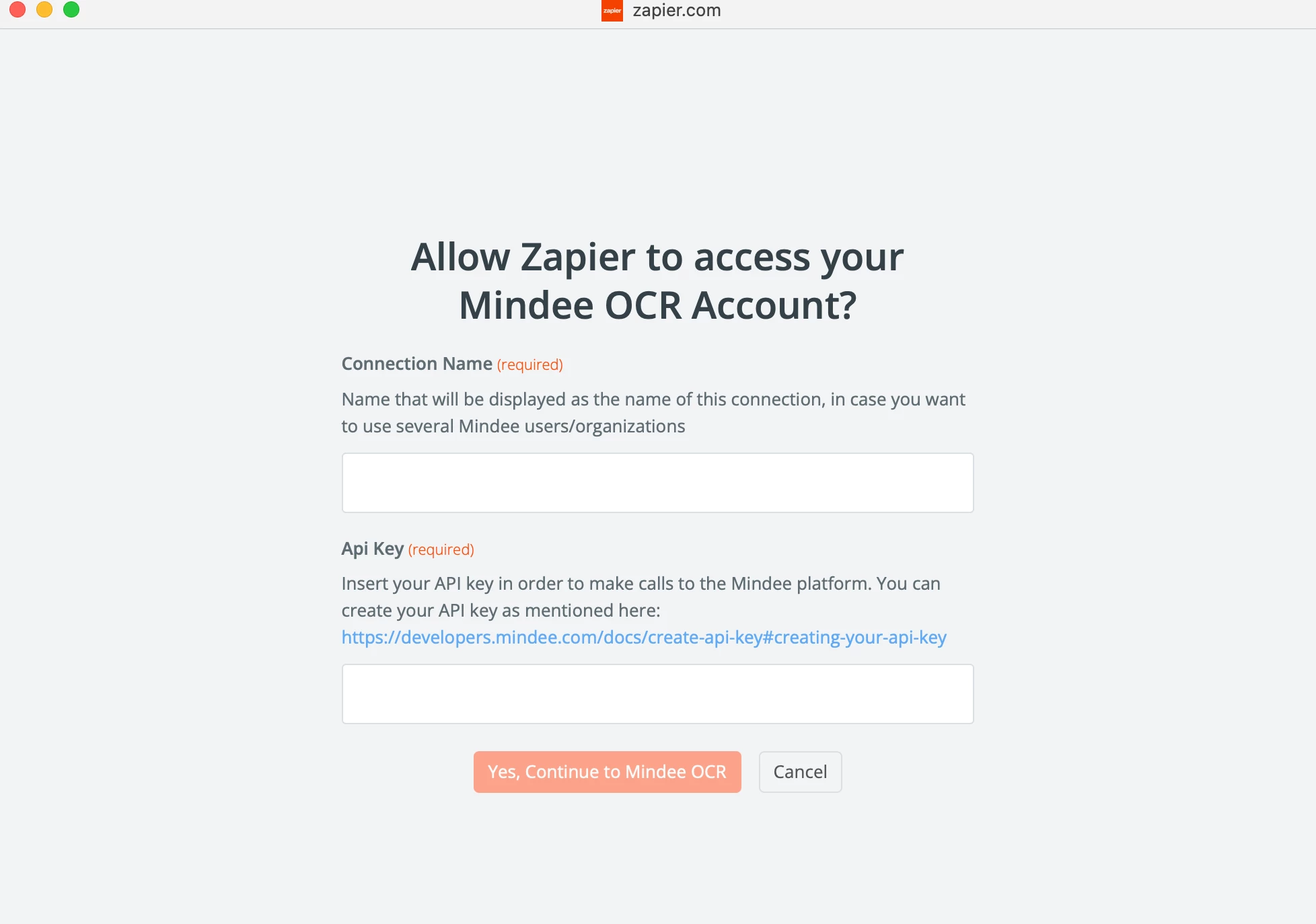 The connection requests that I put the Mindee API key and I do that but getting the following error even though I put in the API key and allow pop ups.  I did this both in Chrome and Safari on MacOS
