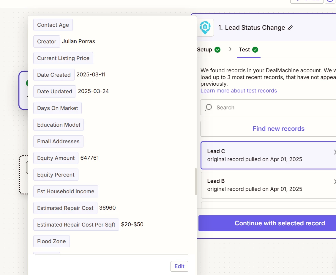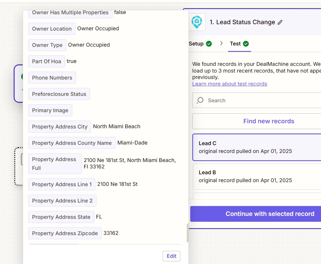 Whenever I test it, the contact data exported from DealMachine appears incomplete — the phone numbers and emails fields always come through empty. This seems to be an error, since most contacts inside DealMachine actually include more than five phone numbers and multiple email addresses.