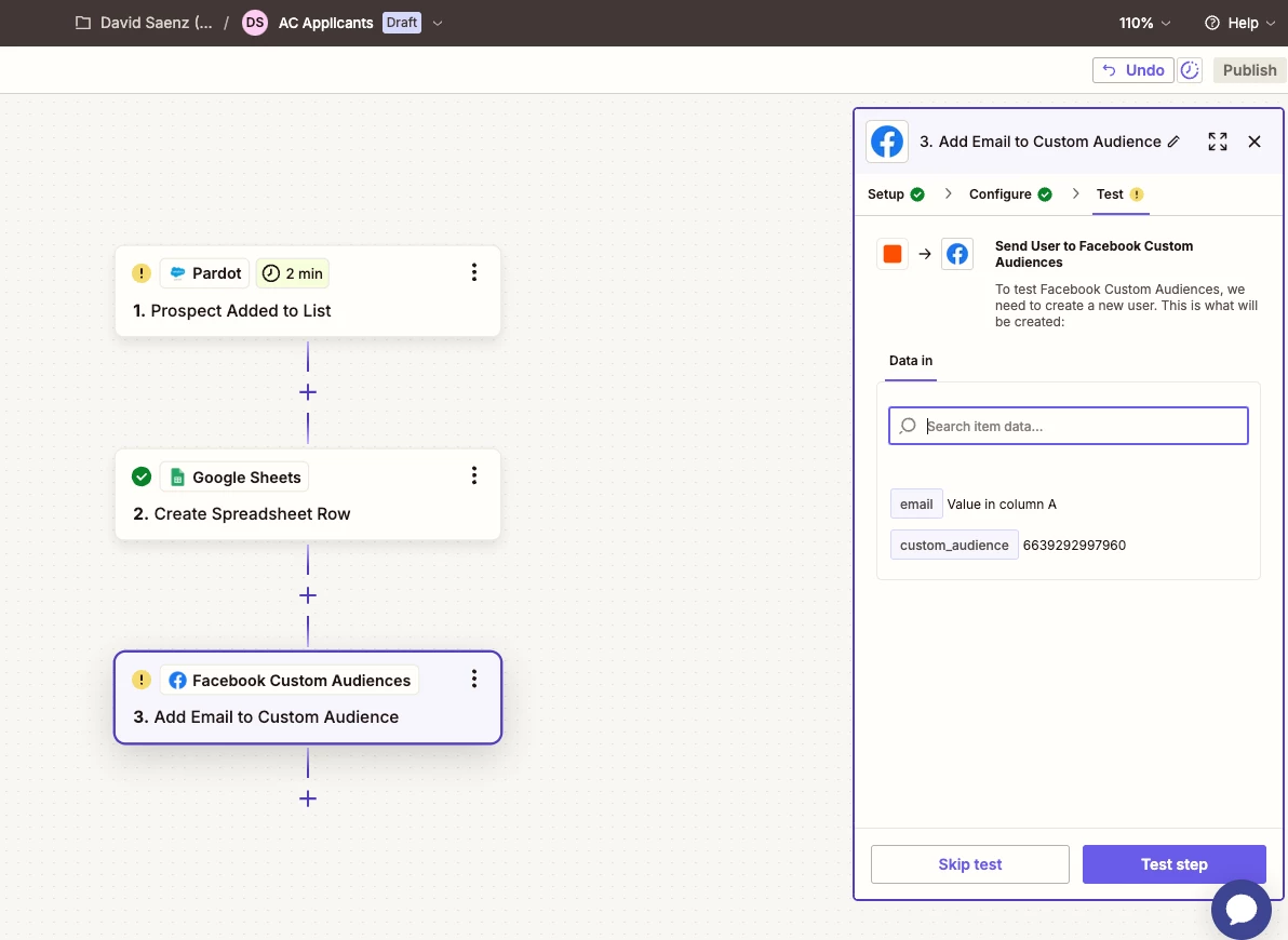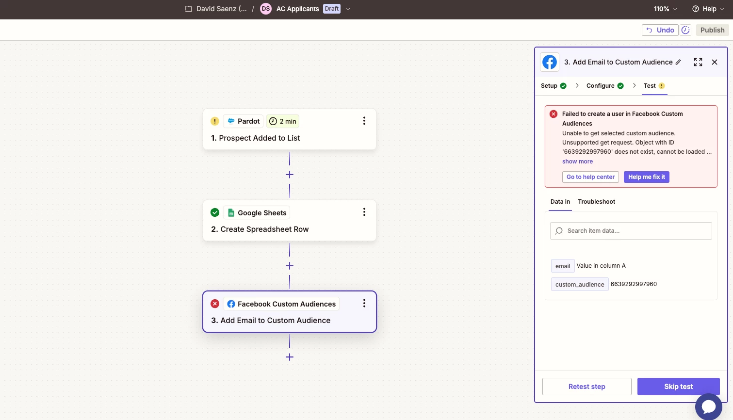 @ken.a I tried entering the Audience ID from Meta Audiences directly as the custom audience field. However, after testing the zap it said it failed.