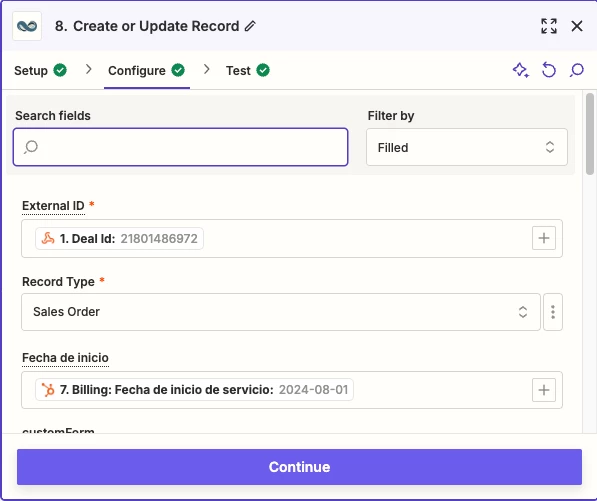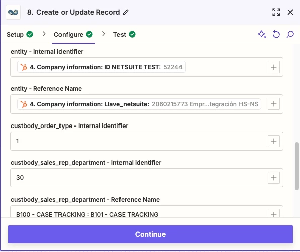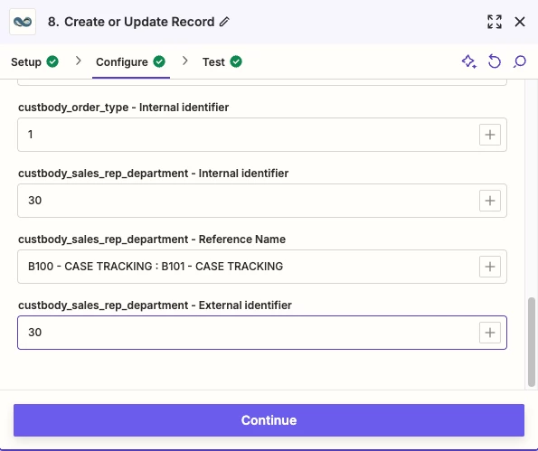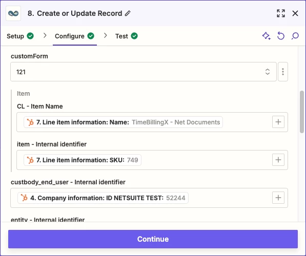 I'm encountering a problem when trying to create records in NetSuite through Zapier. Specifically, I'm unable to filter the correct form for adding values. Instead of showing only the fields for the form I'm working with, it displays fields from other forms, which leads to confusion and errors when trying to ingest the data.