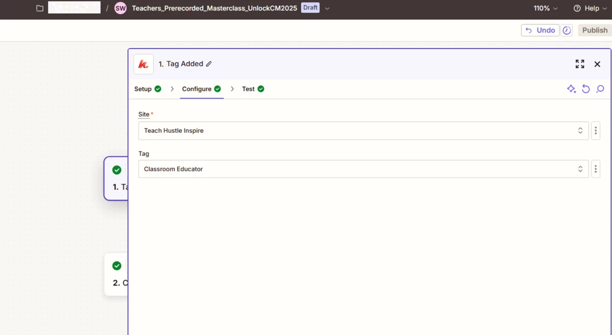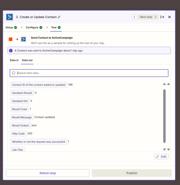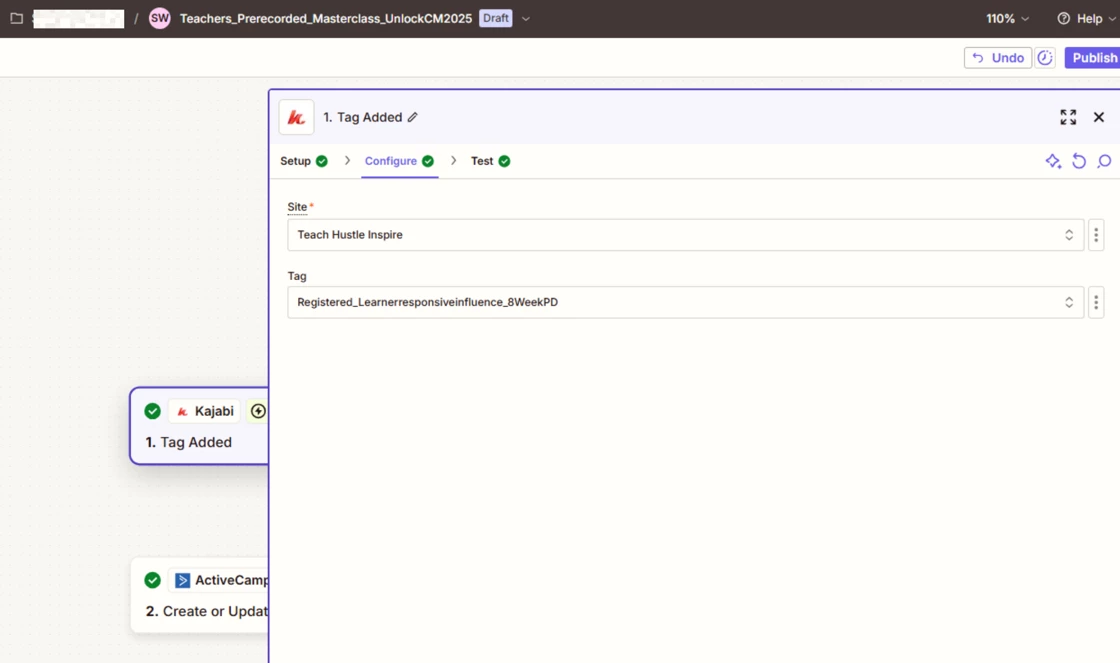 Then in Zapier, I set up a trigger: “Tag Added” in Kajabi → action: update/add contact in ActiveCampaign with a tag. (Basically, I made four separate Zaps, each tied to a specific tag based on the selected dropdown option.)