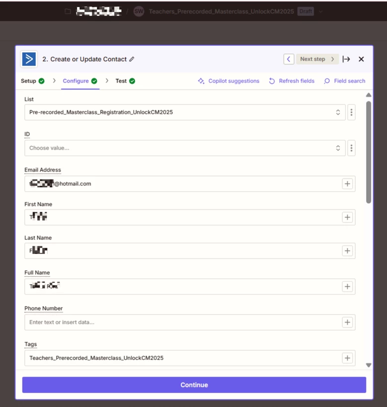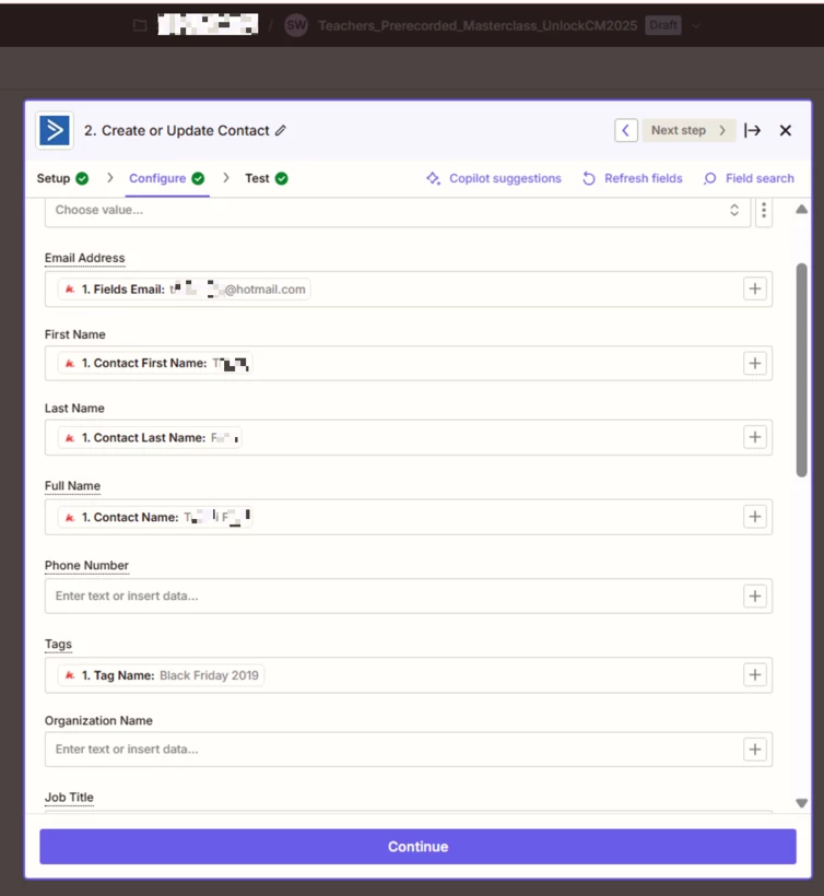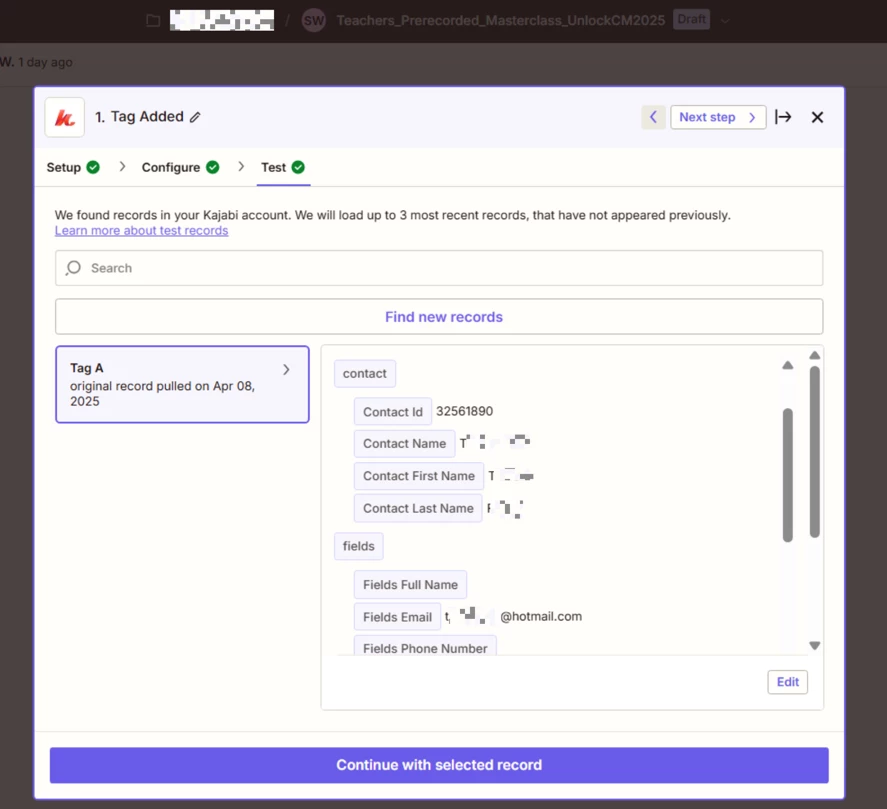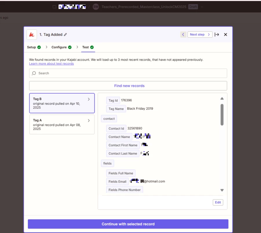Also, when I try to test the trigger in Zapier, it only pulls in the same single contact across all four Zaps, who didn’t even submit the form or have the tag. So now I’m wondering if that’s causing issues too—maybe because the test data doesn’t contain the tag I'm using as the trigger?