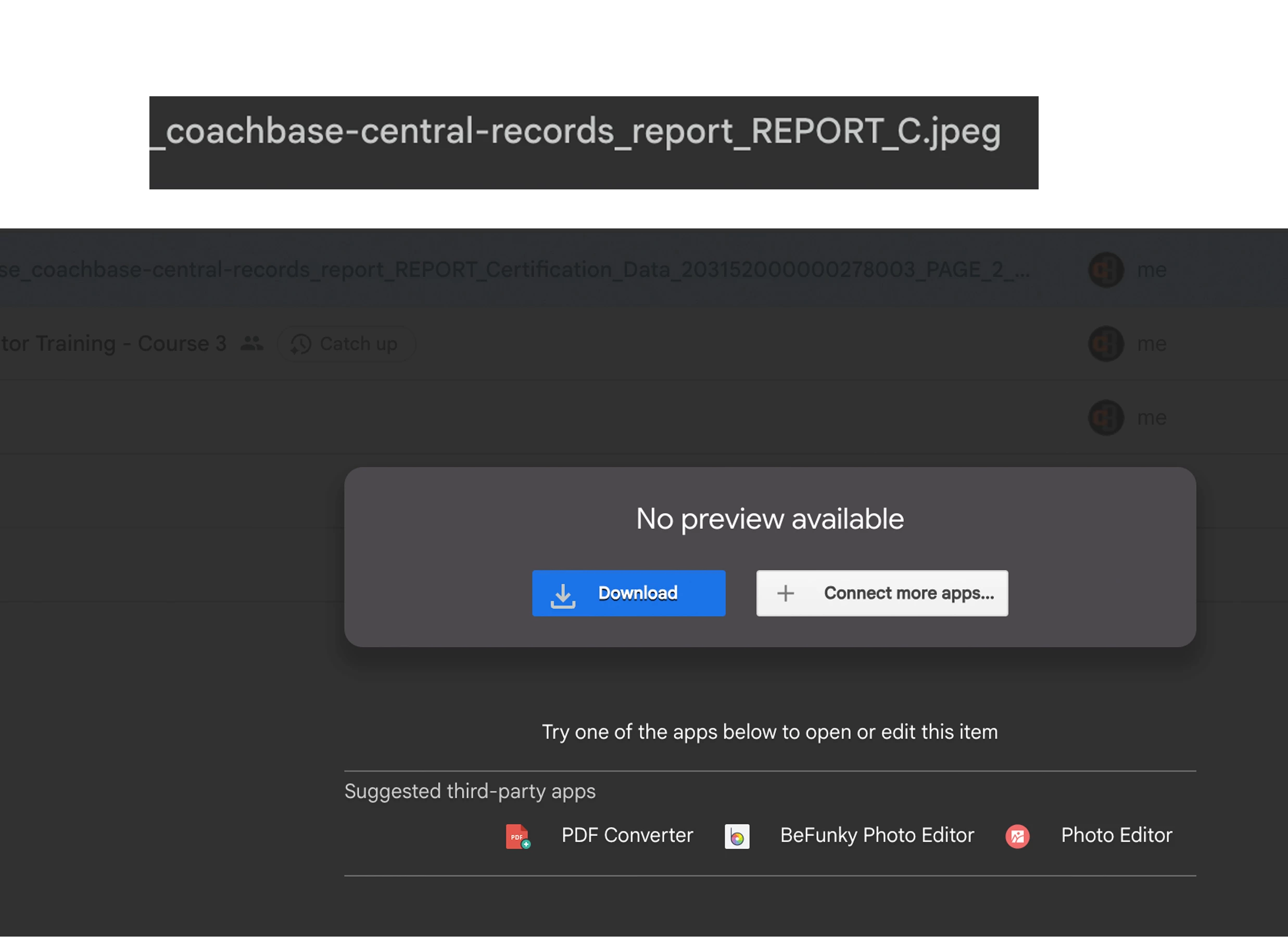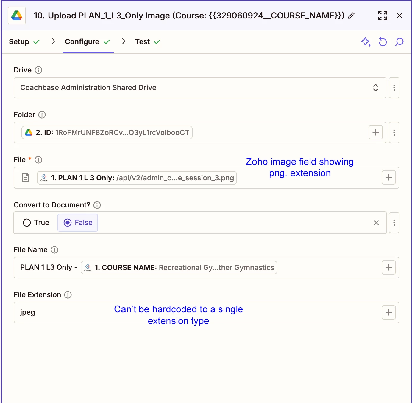 Plus, when we do manage to actually get a file through to Google with the correct extension, i.e by using a Zoho record which has a jpg extension, and a hardcoded jpeg in Zapier’s ‘file Extension’ field, it doesn’t open the image directly, it offers only the option to download the file. When we then download the file and try to open it, it errors.