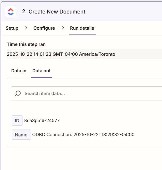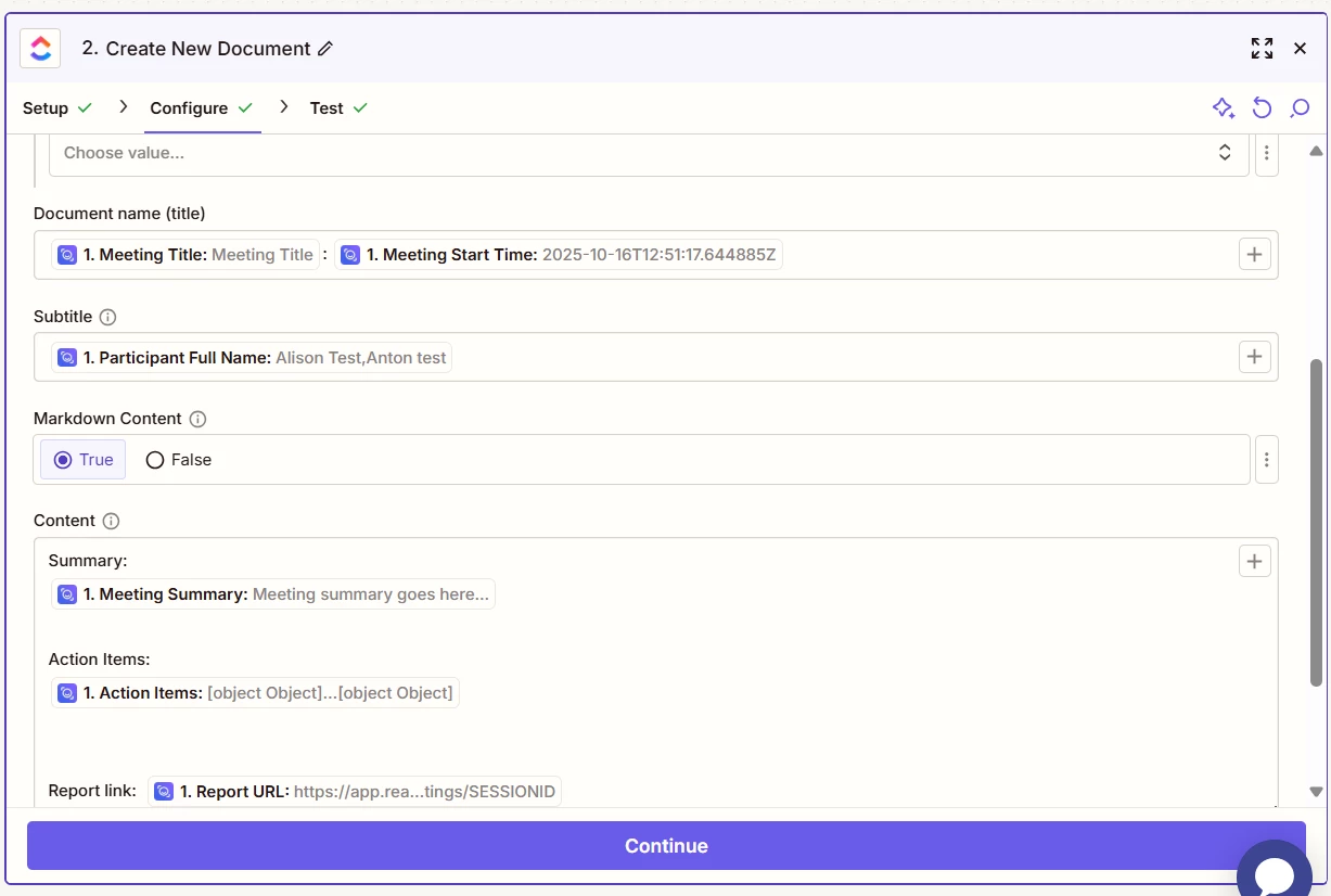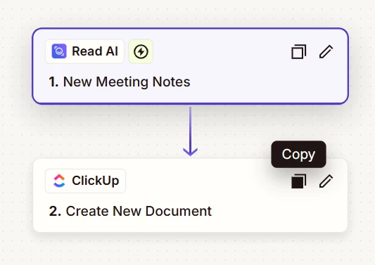 I have a simple Zap that just triggers when a new ReadAI report is created. It makes a new document in ClickUp and puts the report summary in the document and a link to the report.