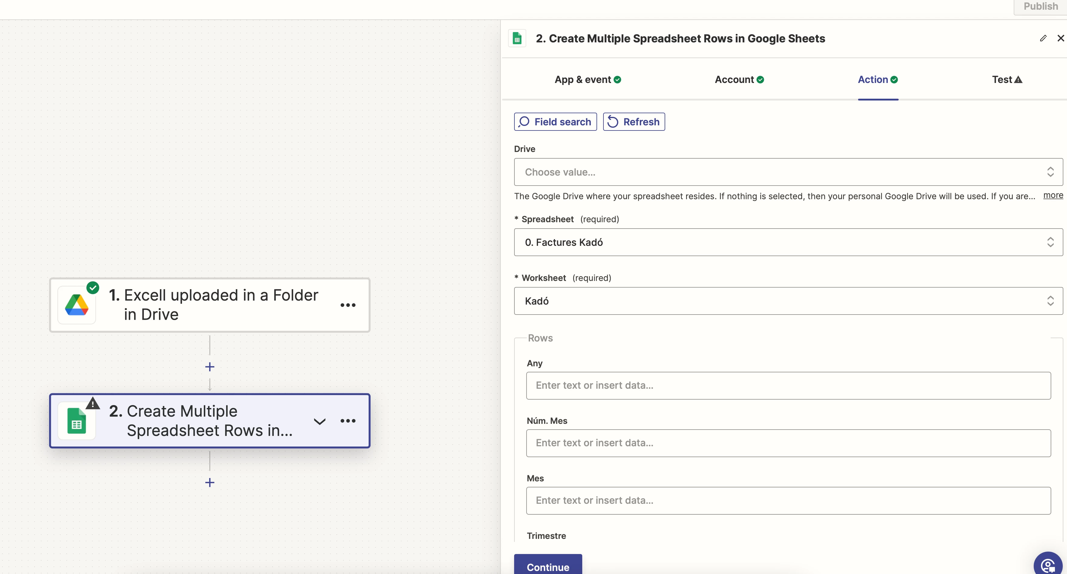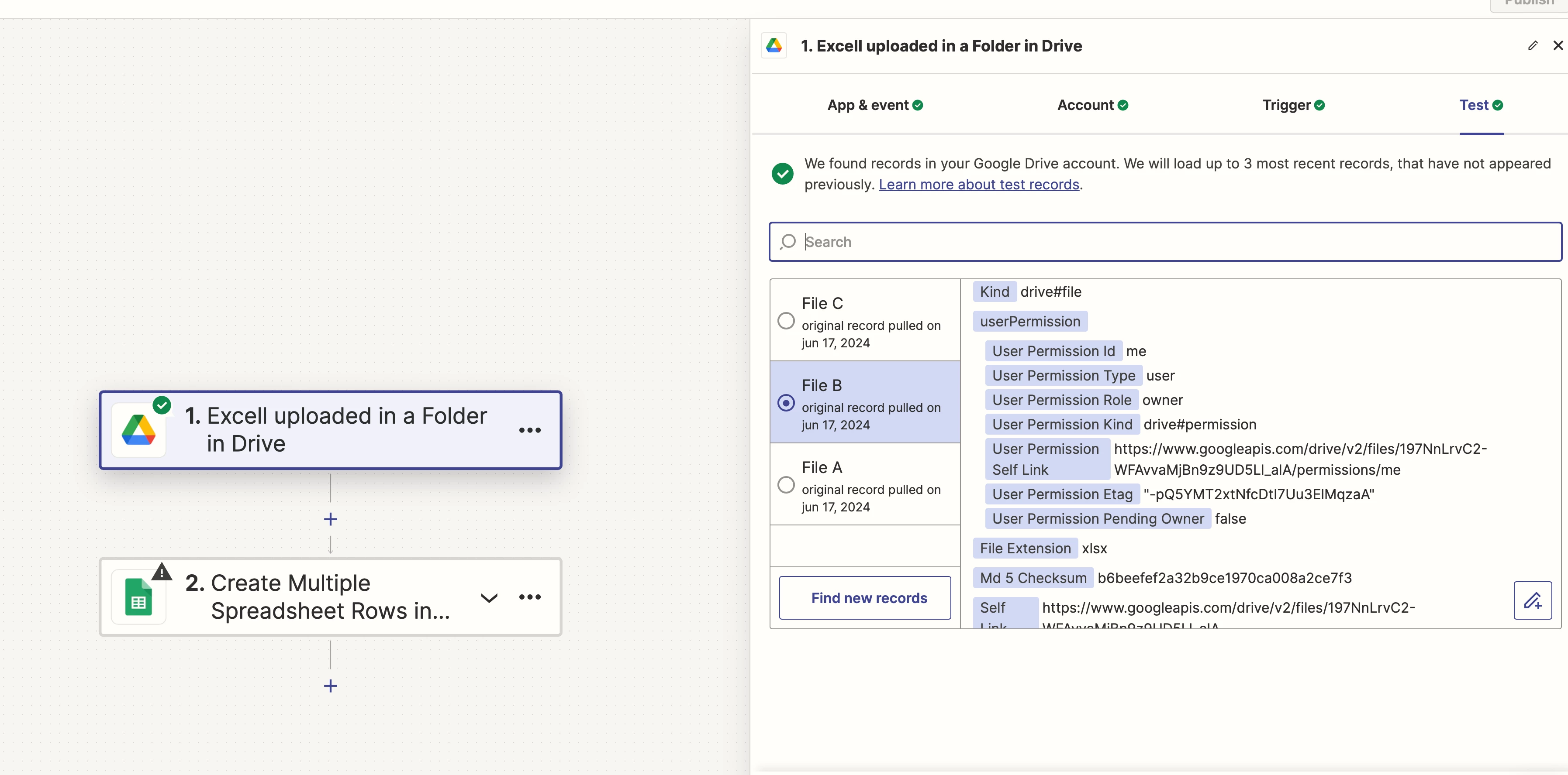 The problem arises when I try to set up the trigger and map the columns from the Excel file. Despite selecting the correct folder and file, the test trigger does not detect the correct records from the specified file. Instead, it shows unrelated data from (I presume) other files in my Google Drive.