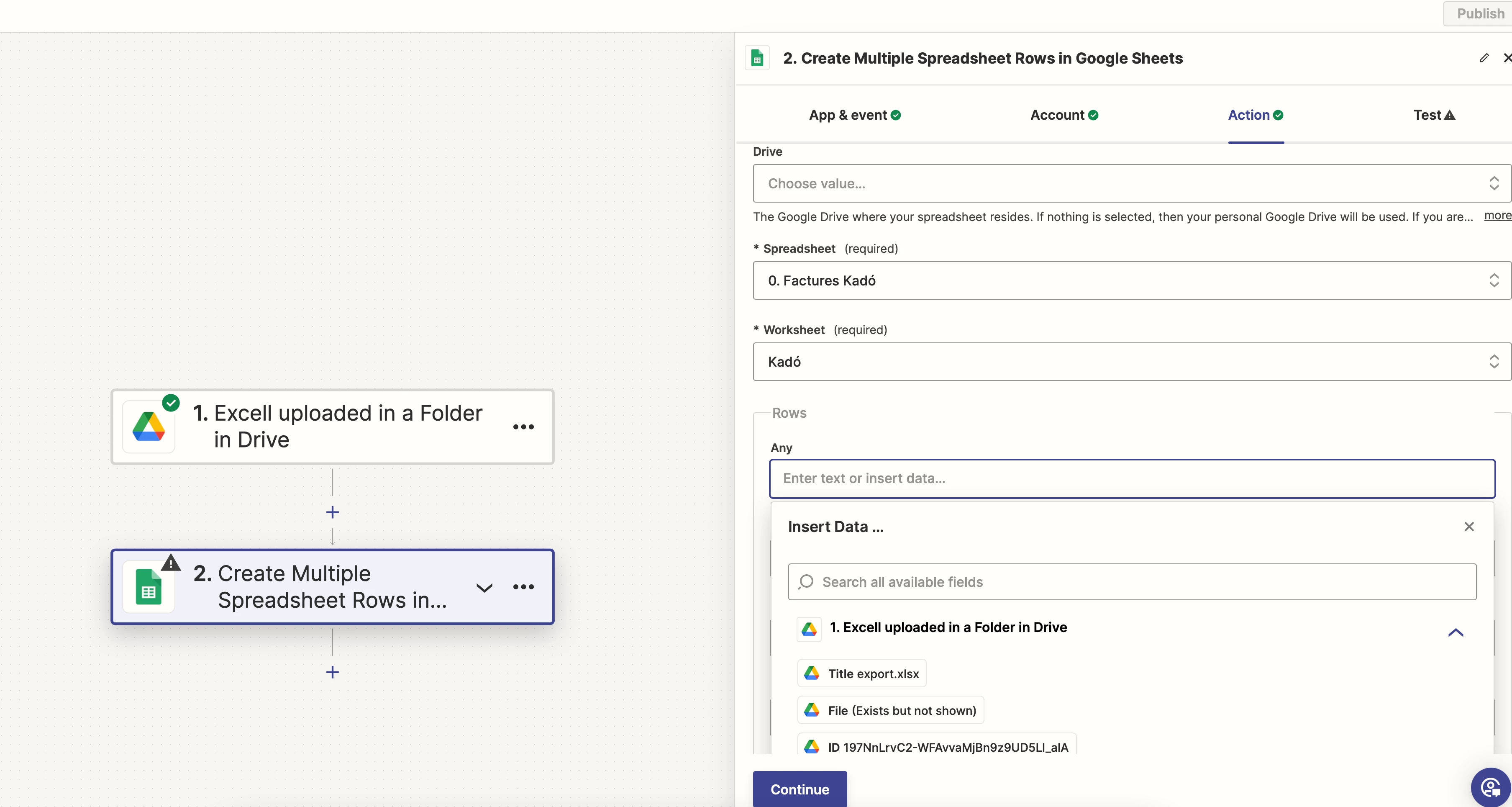 I am encountering an issue with my Zap that involves an Excel file stored in Google Drive.