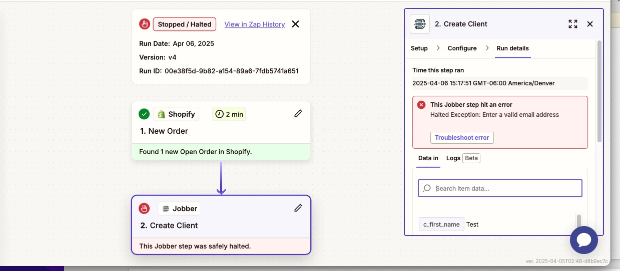 I am using a zapier zap that has my shopfiy website and jobber connected. The trigger on the shopify app is "new paid order" and the action is "Create new client" in jobber. I've been using this zap for the last 2 years successfully. We have a seasonal business and just opened up for this year. We are having issues. A new client in jobber is not being created if the customer doesn't input an email address. Thanks for any help