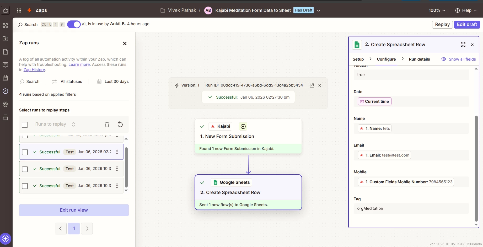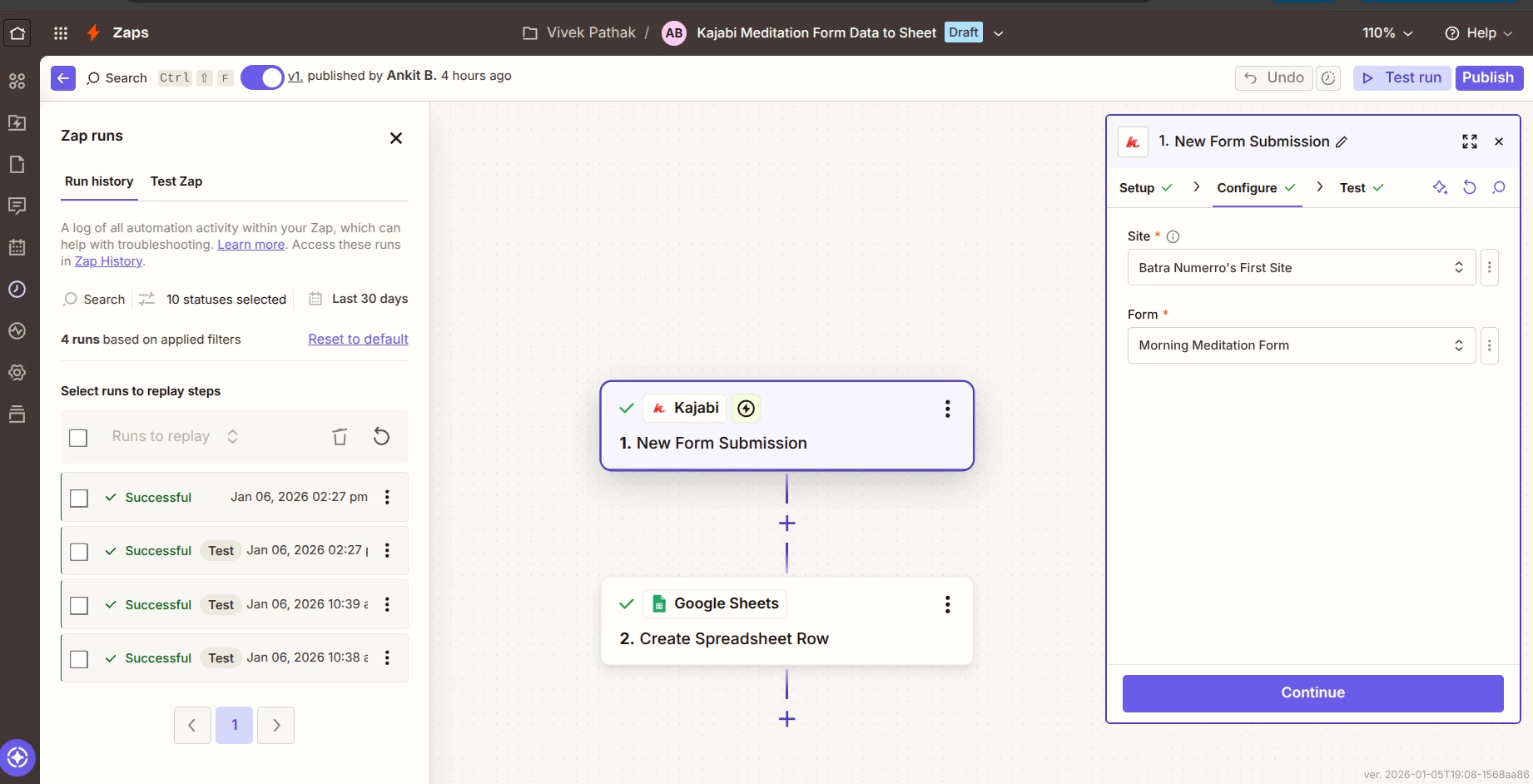 I am facing an issue with a Zap that sends Kajabi form submission data to Google Sheets. The form is working correctly in Kajabi, and the submission data is visible there. Zapier test runs also work perfectly, and test data is successfully pushed to Google Sheets. However, when the form is live and published, the actual user submissions are not triggering the Zap, and no data is being sent to Google Sheets. The Zap is turned ON, the site and form are published, and there are no errors visible in the Zap history—only test submissions are captured, not real ones. Please help me understand why live Kajabi form submissions are not triggering the Zap and if any configuration, permission, or form connection is missing.
