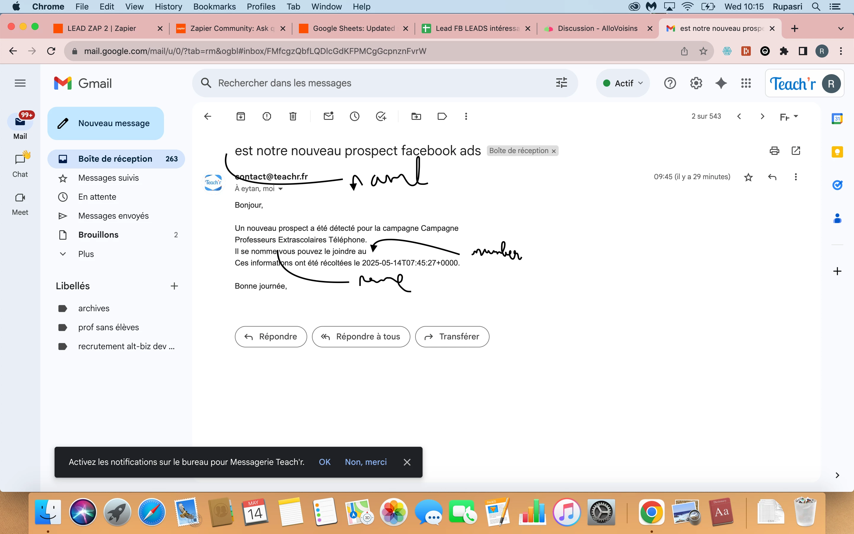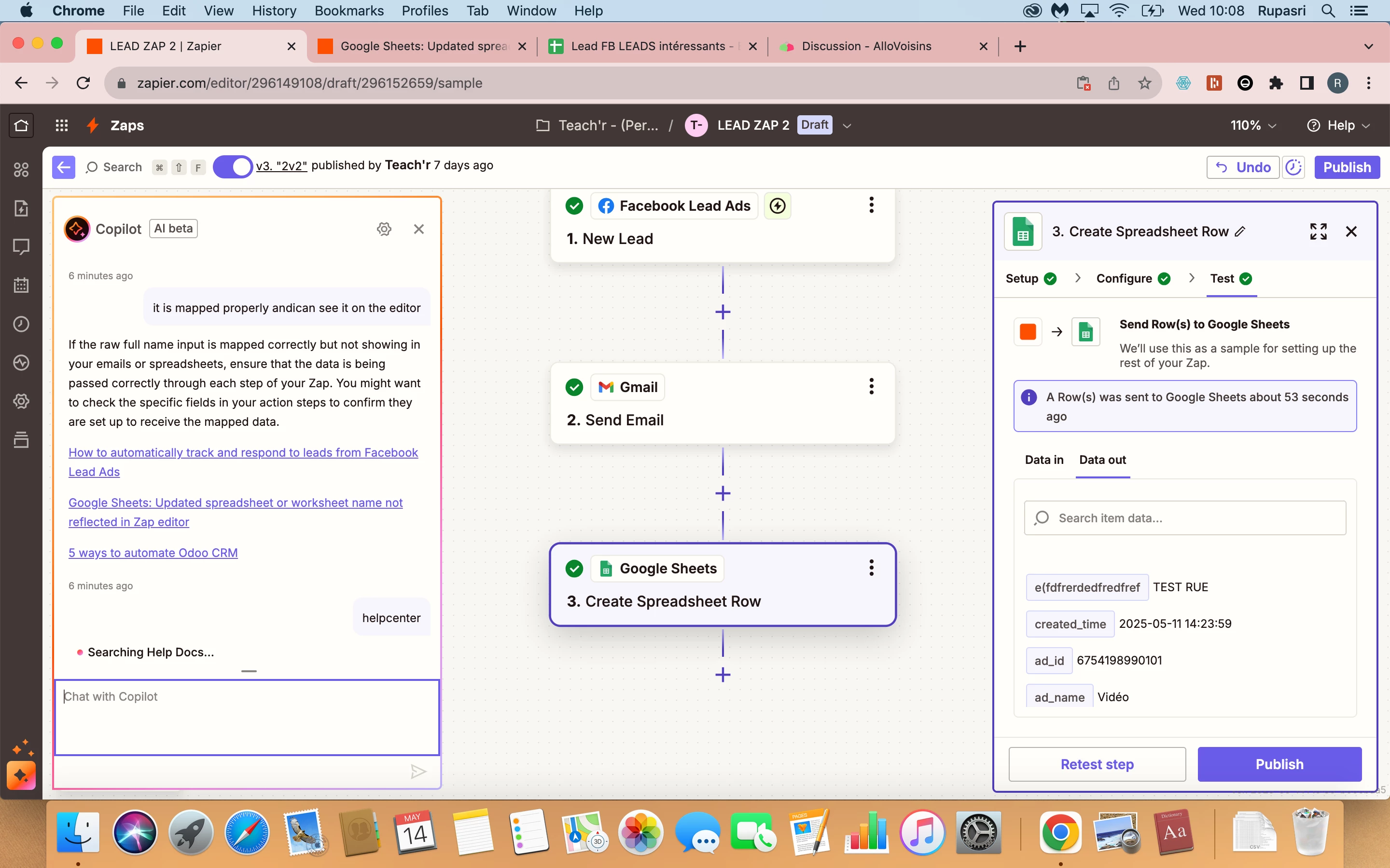So i have this big issue where i made a zap that as soon as the lead fills the facebook form, it sends automatically a mail to our team and creates a row in sheets.