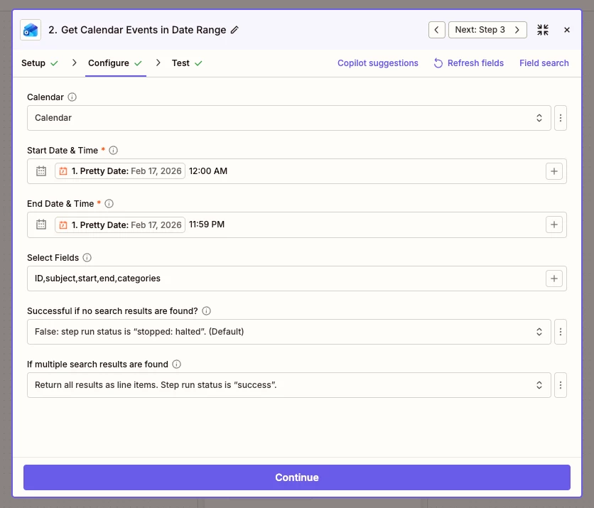 The goal is for the Zap to run daily at a specific time and capture all events from the Outlook calendar for that day, then transfer details such as Event ID, Title, Start Time, End Time, etc., into a Google Sheet.
