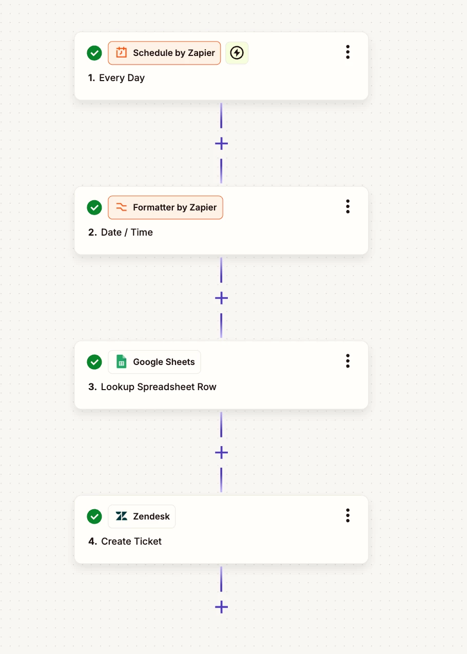 I’m trying to loop through multiple data requests to generate individual Zendesk tickets only when the “Request Date” column matches today’s date. I’ve tried several approaches but haven’t been successful in creating separate tickets for each matching row.