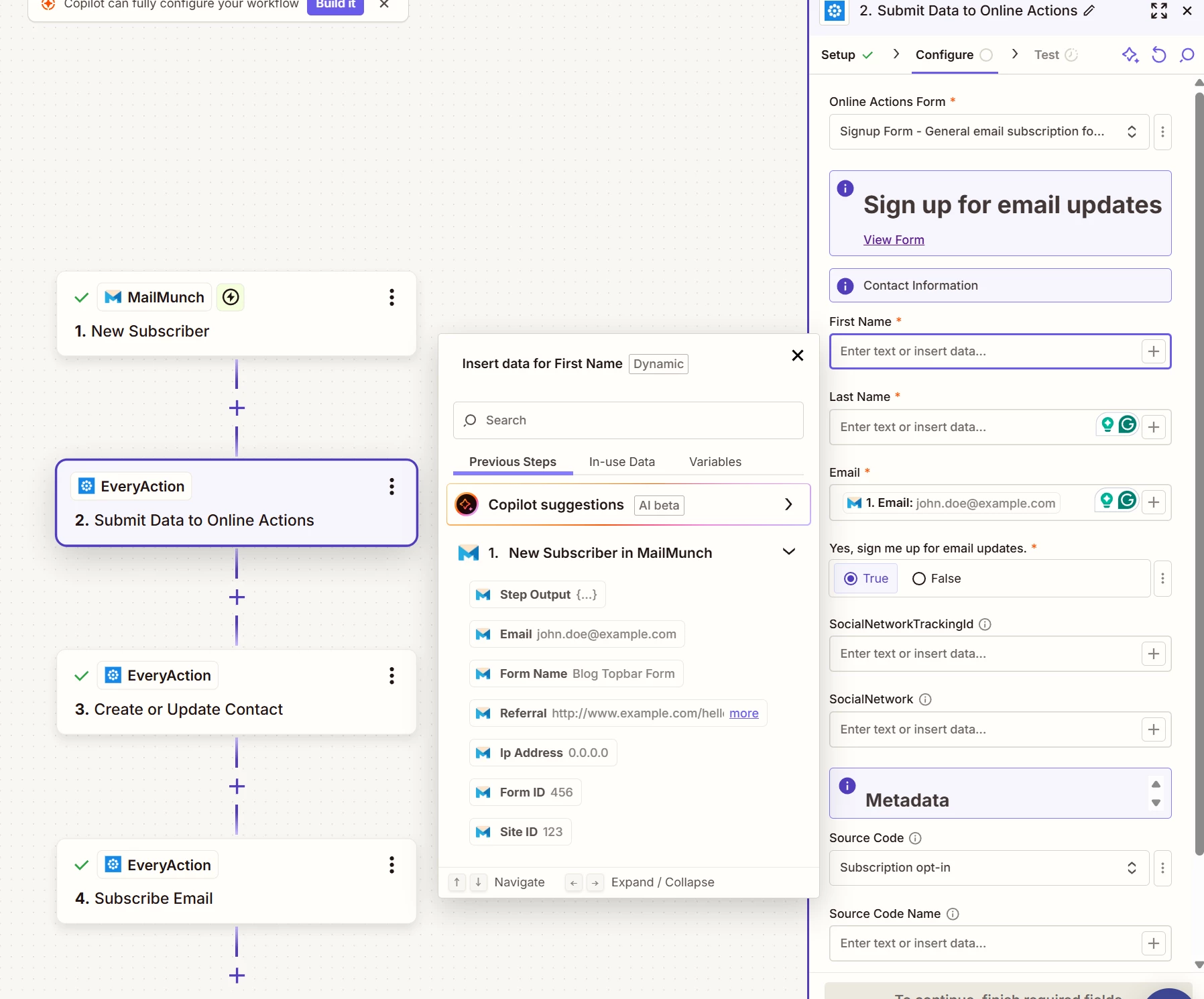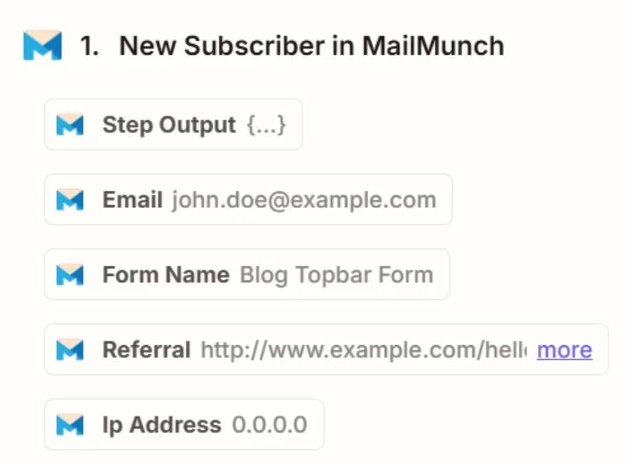 Make sure to test your MailMunch form with real data, then test Zap step 1 again to pull thru real examples to use to configure your Zap action.