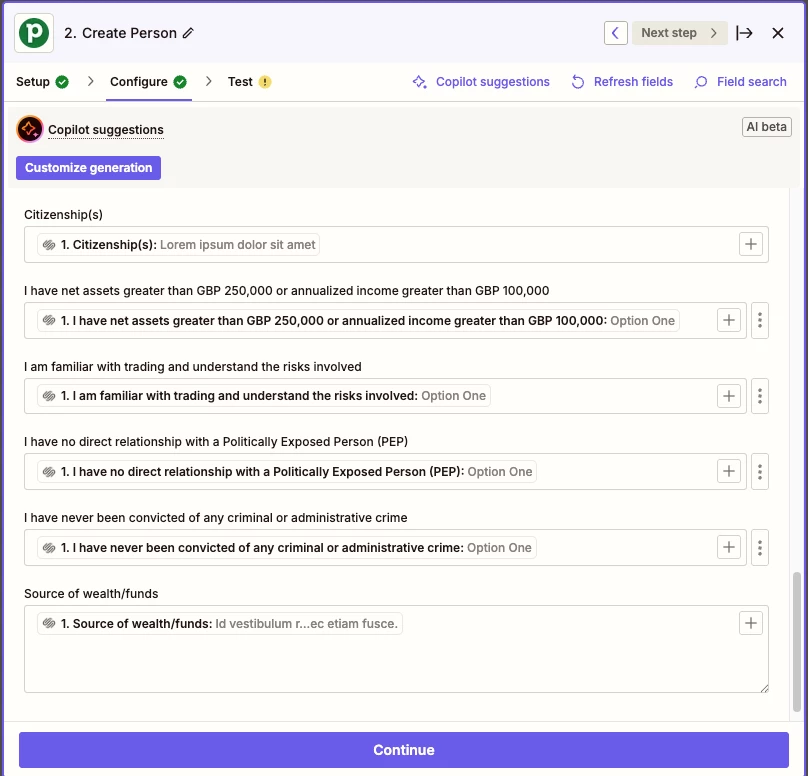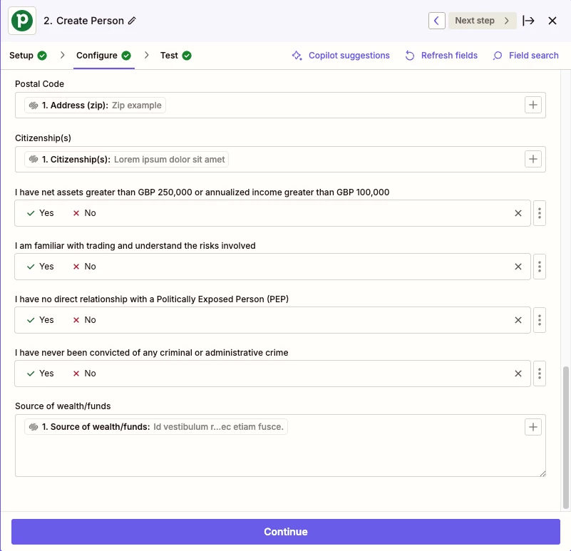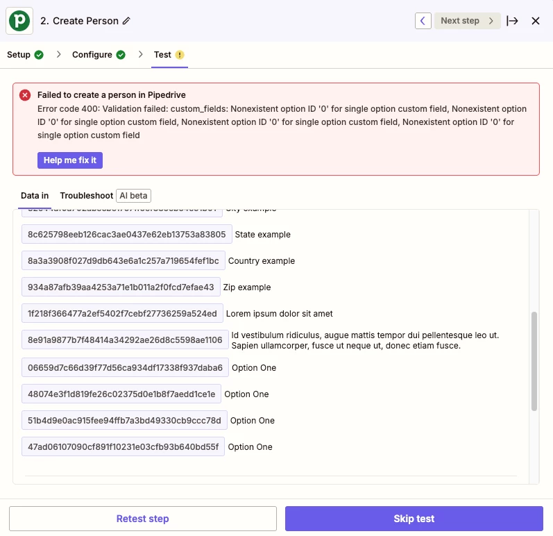 I wish to map a series of “Yes” / “No” radio fields in a Squarespace form to a corresponding set of custom single option fields (under the Person tab) in Pipedrive whose option values are also explicitly “Yes” / “No”. The option values match exactly in terms of case in both systems. I am getting NO values for the fields in Pipedrive upon submission of the Squarespace form, nor do I see any complaints from the Zap. I tried setting the same fields in Pipedrive to text types thinking that there may be some issue with the literal values not matching exactly, but still no luck. Thanks for any assistance with this!