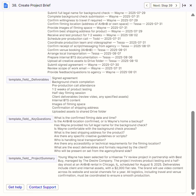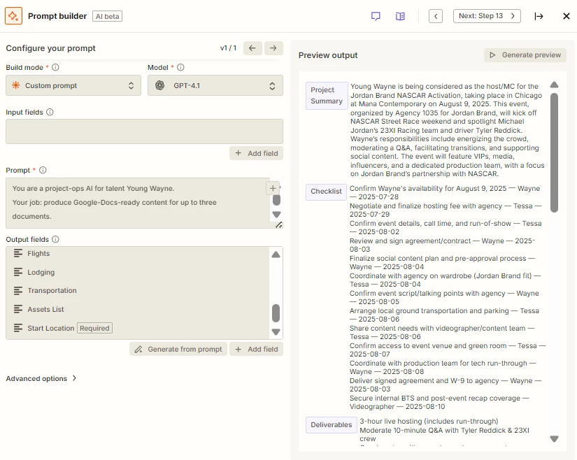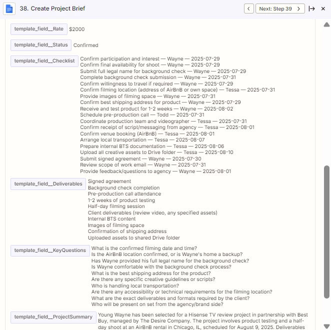 Step 2: A ChatGPT action reads that row, then generates the project summary, checklist, deliverables, travel notes, etc.—all the merge-field text our Google-Docs templates need.