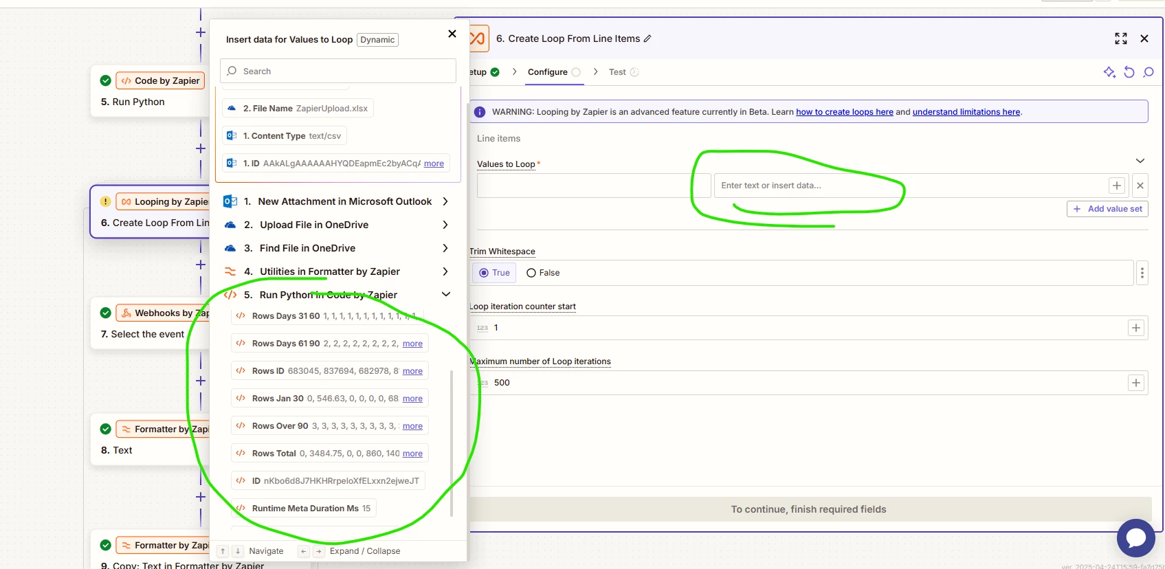 You likely want to add each of the data sets from your Python output as the values to loop in step 6.