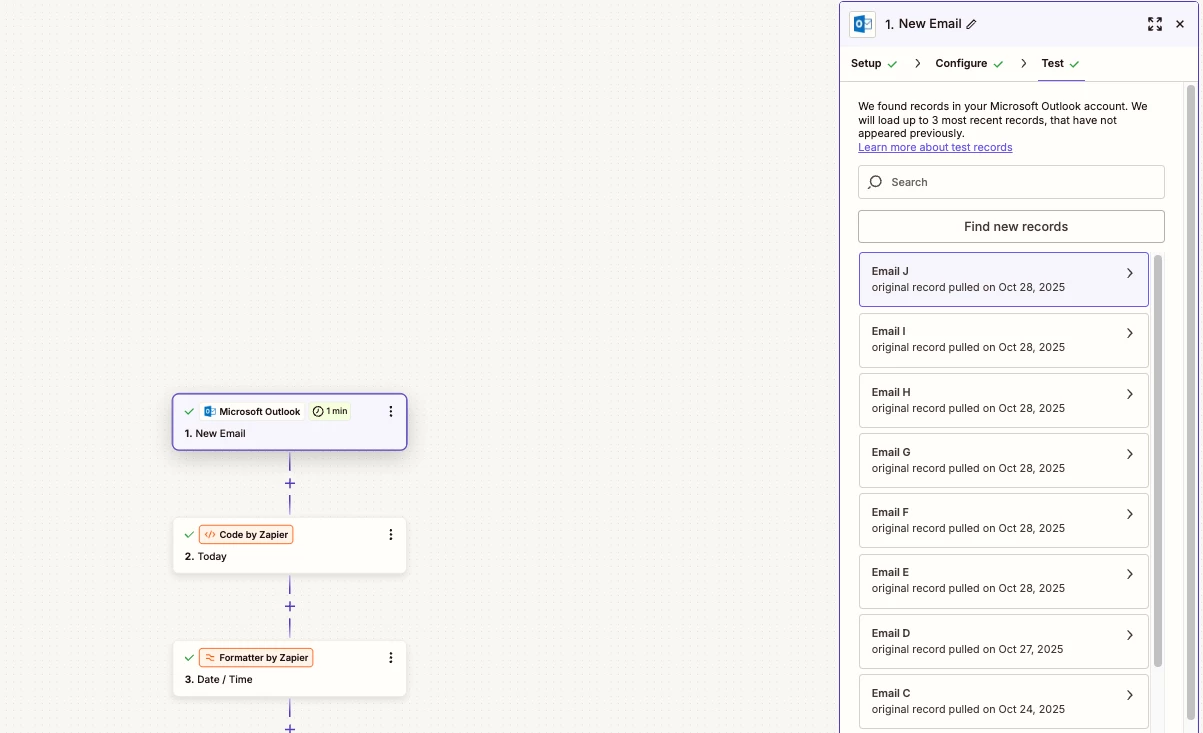 But the weird thing is that when I clear the selection of the shared inbox, and try and find new records, the records indicate that it’s pulling emails from MY outlook and not the outlook setup in the trigger step.