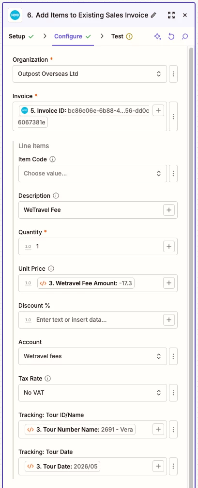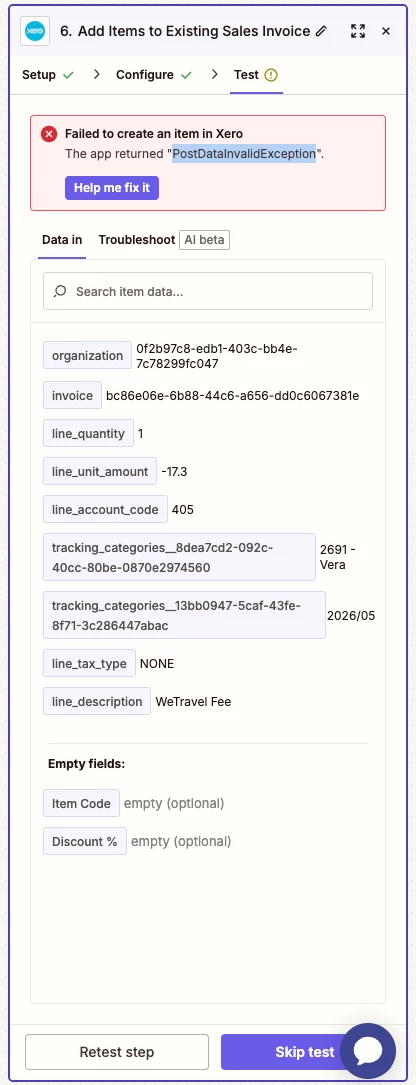 I am getting a “PostDataInvalidException” error when attempting to add a line item to an existing sales invoice with Xero. The sales invoice is creating in Step 5 of the same Zap, and the invoice ID is pulling from that step. I have verified that the sales invoice is created in Xero, but I am still getting an error when attempting to update the sales invoice. I have tried both the Invoice ID and the Invoice Number from Step 5, and get the same error with both.