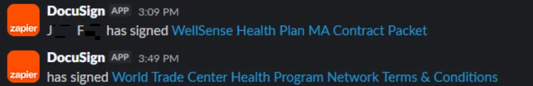 Below is a screenshot from Slack from last week, 9/11, showing the last notification that was able to capture the ‘Recipients Signers Name’ from DocuSign (i.e. Jxxxx Fxxxx), and the first notification where it began to no longer capture it. The portion in blue is the ‘Documents File Url’ field from DocuSign, which will differ based on the specific client, however, the current failure of capturing the ‘Recipients Signers Name’ exists across the board, regardless of the client.