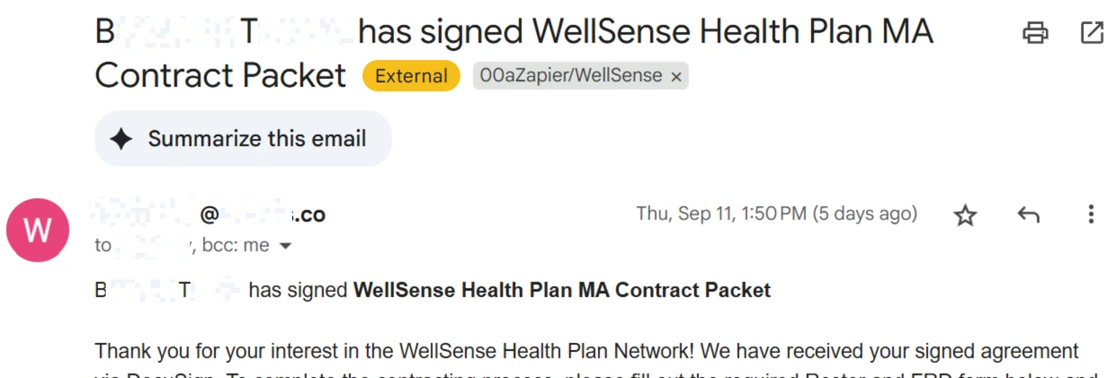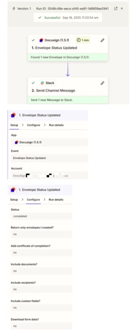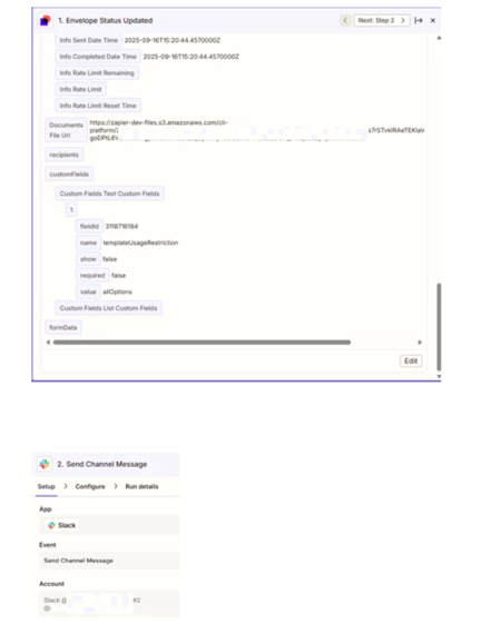 We have two types of Zaps that provide notifications based on Envelope Completion from DocuSign: one that sends a notification via a Slack channel, and one that sends an email (originating from a Gmail account).