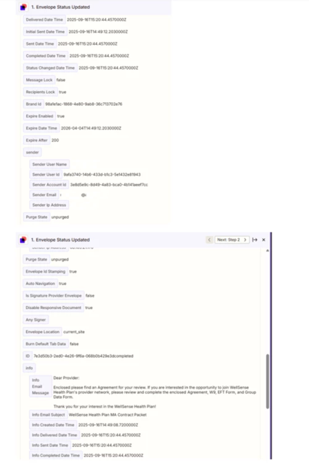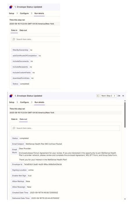 Both Zaps are functioning, but are no longer capturing the ‘Recipients Signers Name’ and ‘Recipients Signers Email’ fields from DocuSign. This started occurring on 9/11/2025, sometime between 3PM and 4PM EST. It seems like the new version of DocuSign (1.5.1) could be related? I have seen other posts that suggest going into the Zap rule and removing, then adding back the DocuSign connection as a sort of refresh, ensuring the latest version is being used. I have attempted that, but still getting the same results.
