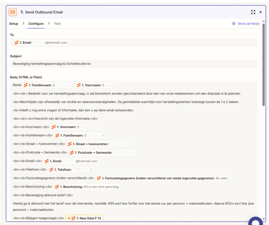 So basicly i have a form that clients can acces with a link. They fill in their information, press send and then this information comes in a zapier table + in my Monday app + the client gets a confirmation email, as well a confirmation email for me.