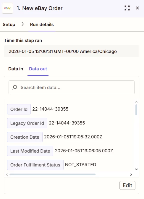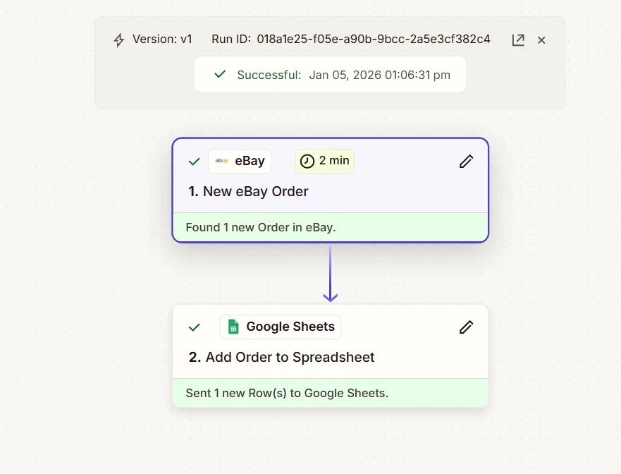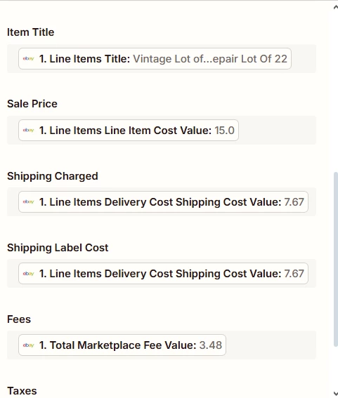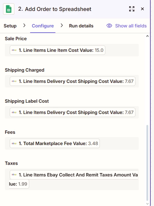 I am trying to make an automation that will take information from eBay and add it to my Google Sheets in order to track my revenue from eBay. I have the trigger for “New Order”. When I test that step, it is able to pull the data, I mapped the eBay data to the correct fields in Google Sheets, but when I tested the final automation, nothing showed up in the Google Sheet. I am not sure what is going on.