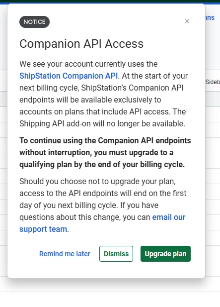 I received the attached notice from ShipStation this morning. The notice informs me that with the next billing cycle, I’ll need to upgrade to a plan that includes access to ShipStation’s Companion API endpoints.