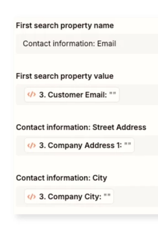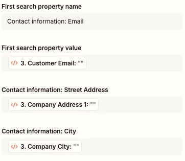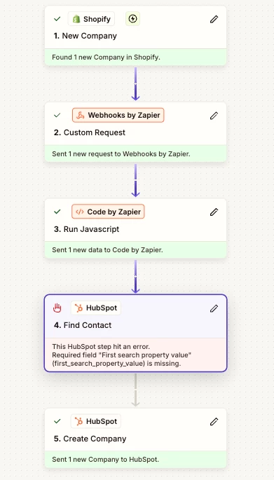 I am running into an error with the “Find Contact” Hubspot step. The error message is: Required field “First search property value” is missing. The Shopify “New Company” Trigger data is GraphQL and the data that I need to move into Hubspot is in these Edge Node fields.