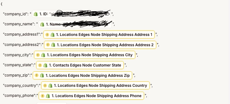 Context: I am trying to create a workflow which automates Hubspot Contact & Company creation when a new Shopify company is created. So the general workflow looks like this: