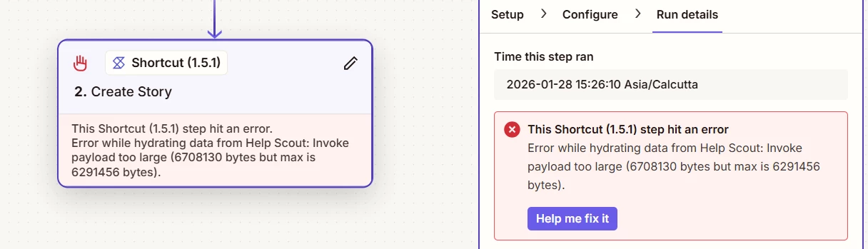 The step failed because too much data was sent from Help Scout.