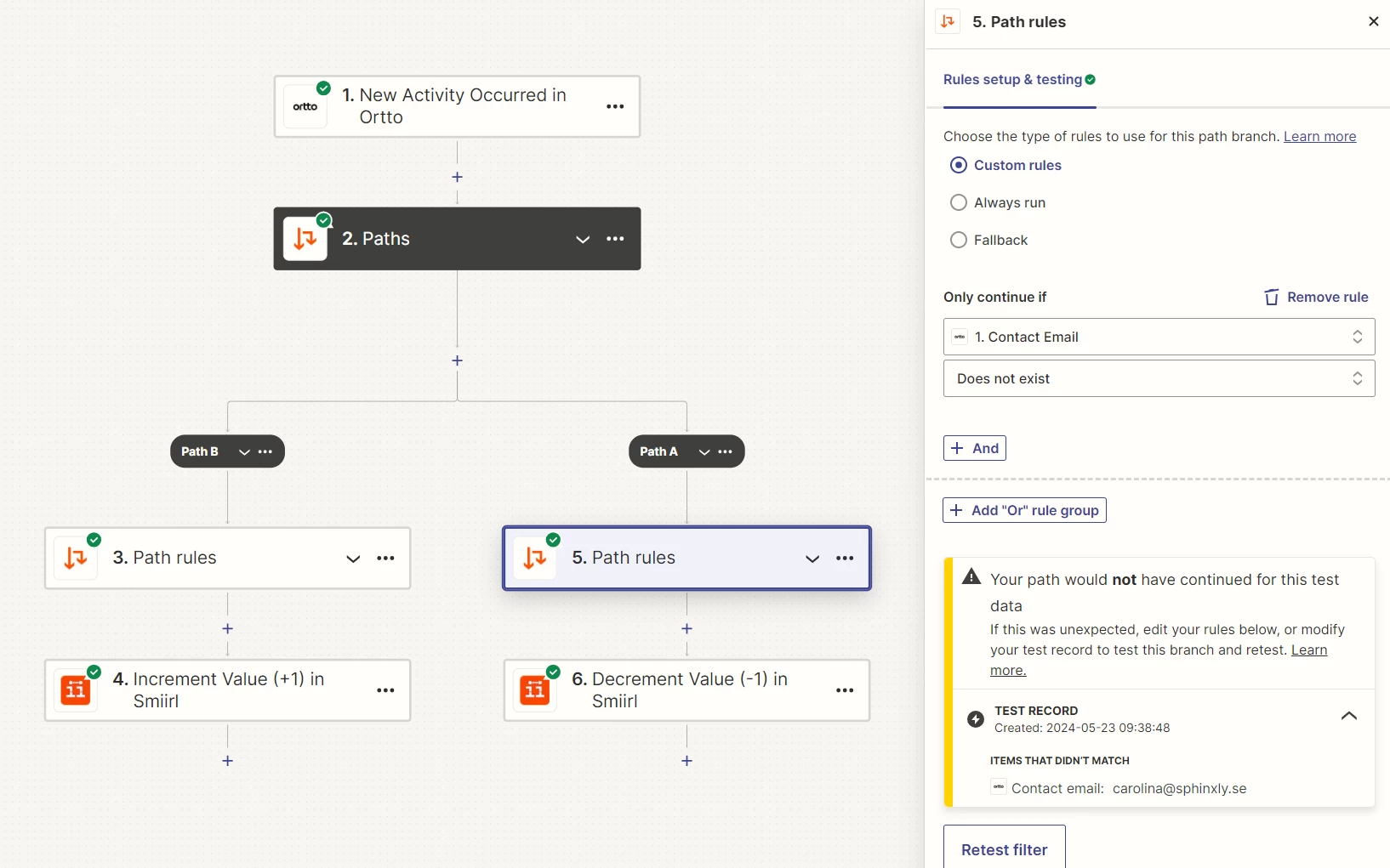 "Your path would not have continued for this test data. If this was unexpected, edit your rules below, or modify your test record to test this branch and retest. Learn more."