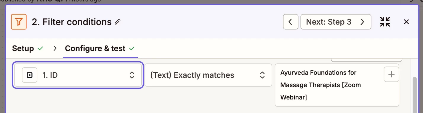 If you want to filter by “Ayurveda Foundations for Massage Therapists (Zoom Webinar)”, switch the left field from ID to the field that actually contains that text like Event Name or Title.