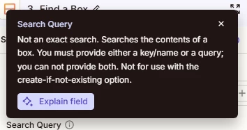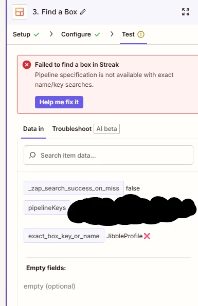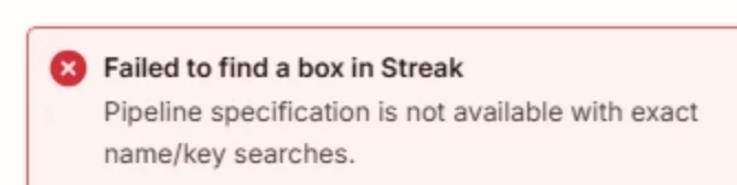 I’ve been having an issue where I am not able to find a field/column in streak using the exact search and search query fields. I’m trying to access my streak CRM using find a box to find records that have jibble profile IDs that I can use for other actions. I’m getting the “failed to find a box in Streak” error when I put my column name.