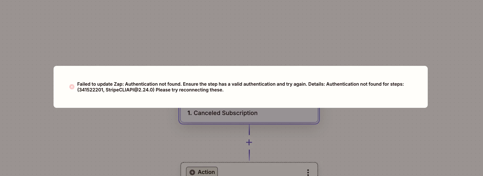 I’ve created multiple zaps with my Stripe account today and everything was working smoothly, tests were passing in the flow, and then when I went to create my final zap (a trigger for when client’s cancel their subscriptions), suddenly everything stopped working. Now I can’t get my Stripe account to reconnect and stay connected. It will connect for a sec and then go right back to disconnecting.