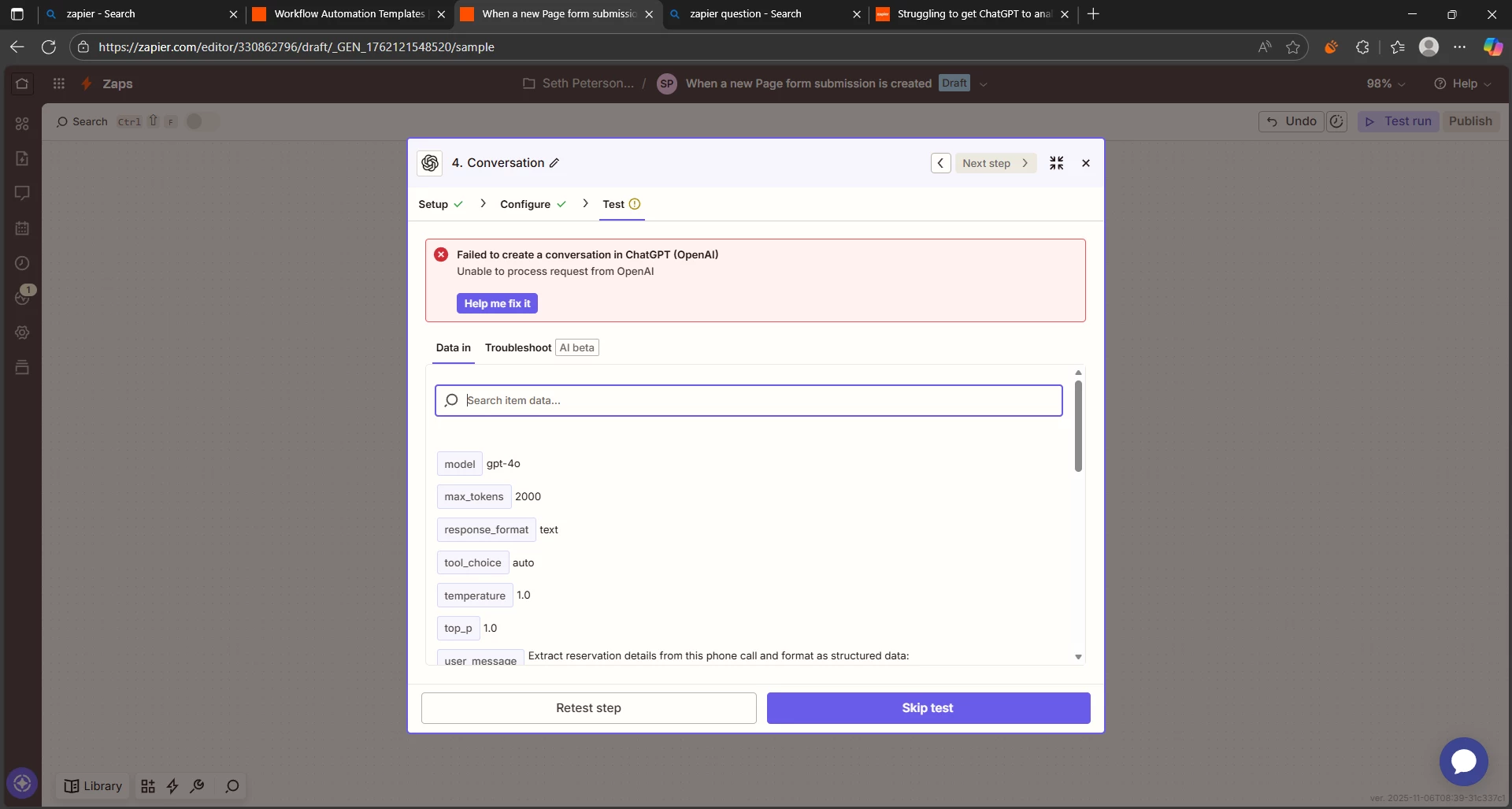 I'm creating a dummy workflow currently to test out AI phone call automation; I’ve gotten everything else working properly other than the conversation analysis. I make sure to keep the version in gpt-4o but every time I try and test it sends me back a failed notification. Any help would be greatly appreciated.