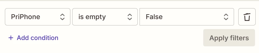 I have a table with basic contact information, including a phone number. If I use the Filter button to add a “is empty” = “false” condition, it does not filter out some rows where that field is apparently blank.