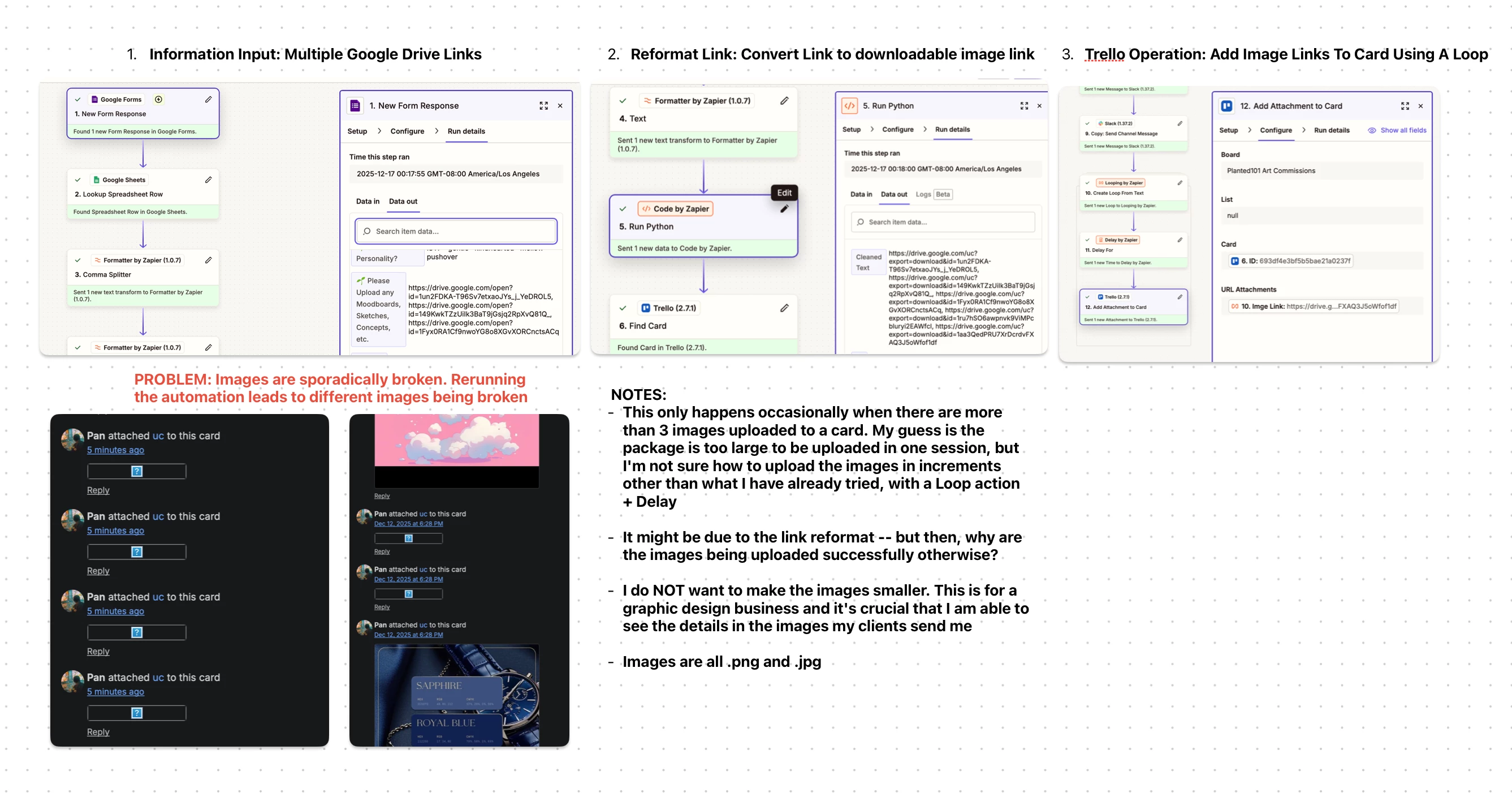 I have been running into problems with multiple images being uploaded to trello and was wondering if anyone could please help with this. To summarize the workflow in the image I attached: