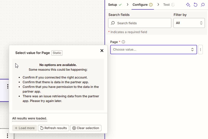 Sorry to hear that your page wasn’t appearing in the Zap, and manually selecting it by entering it’s ID as a custom value didn’t work wither.
