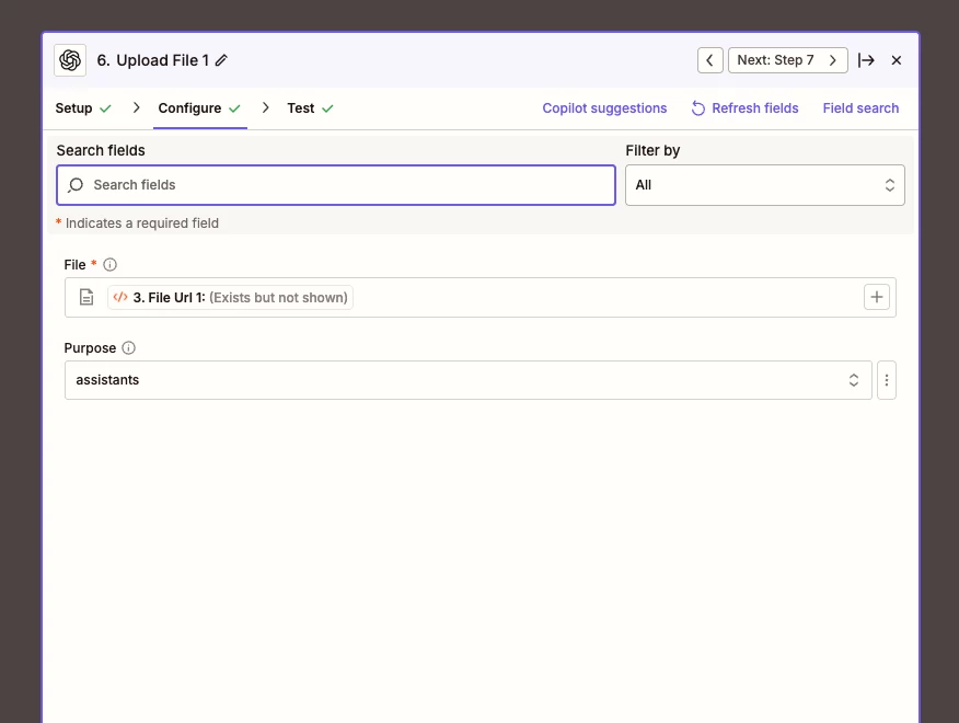 The filtered file URLs are then passed to several “Upload File to OpenAI” steps using the “assistants” purpose.