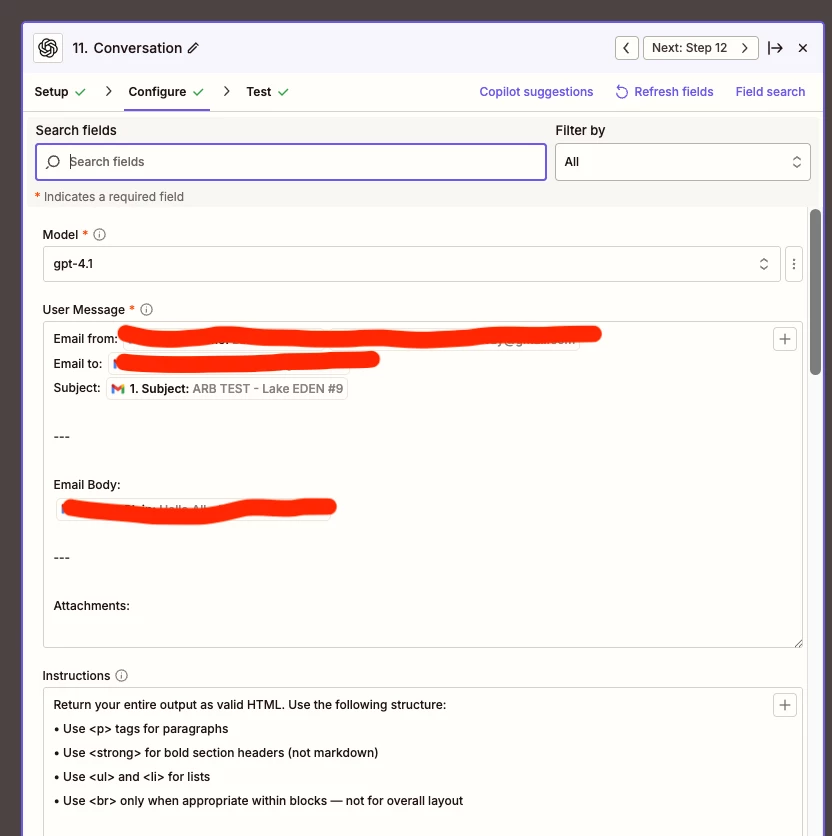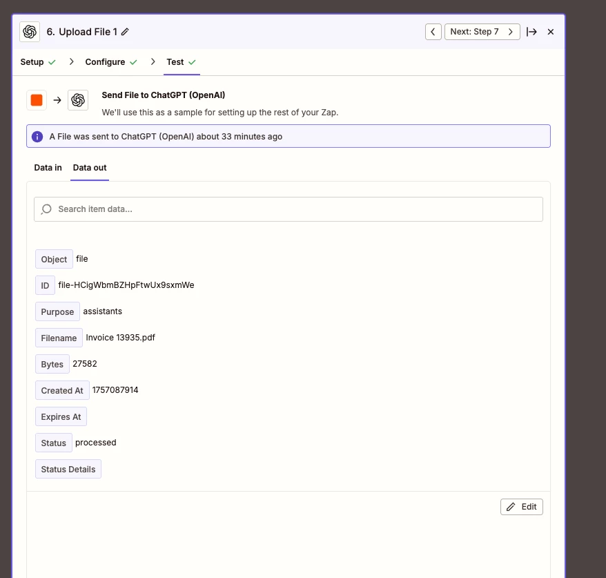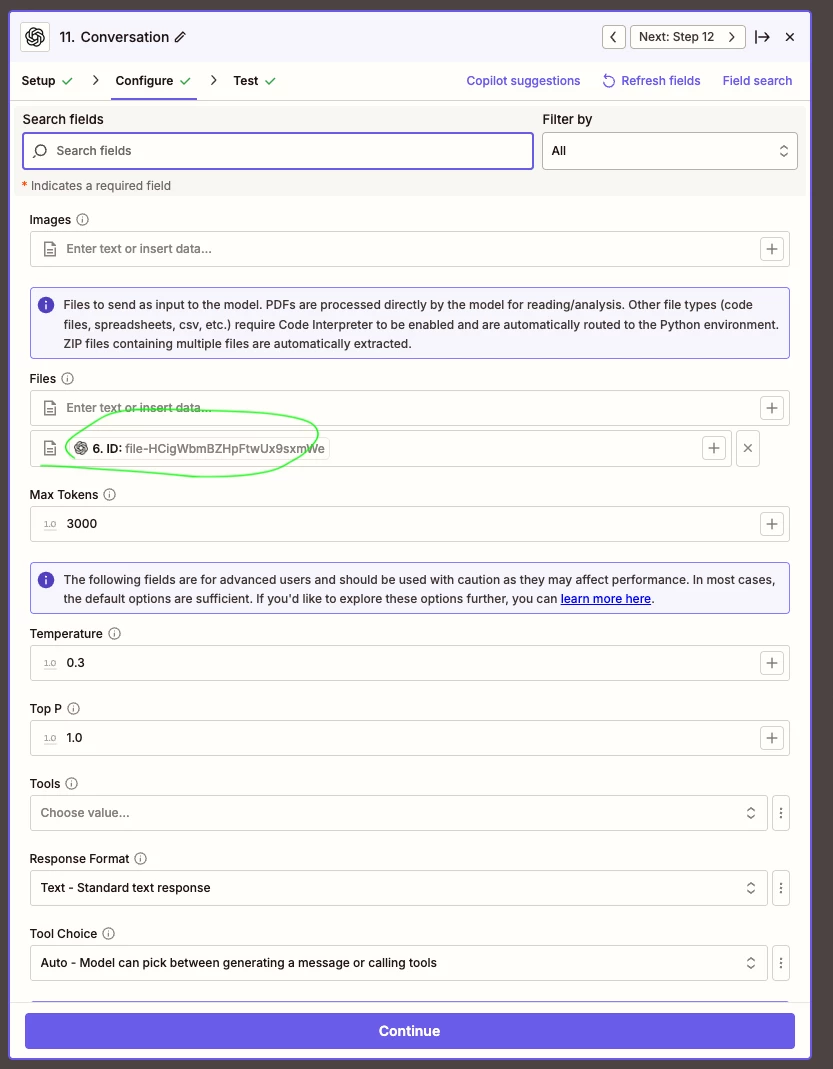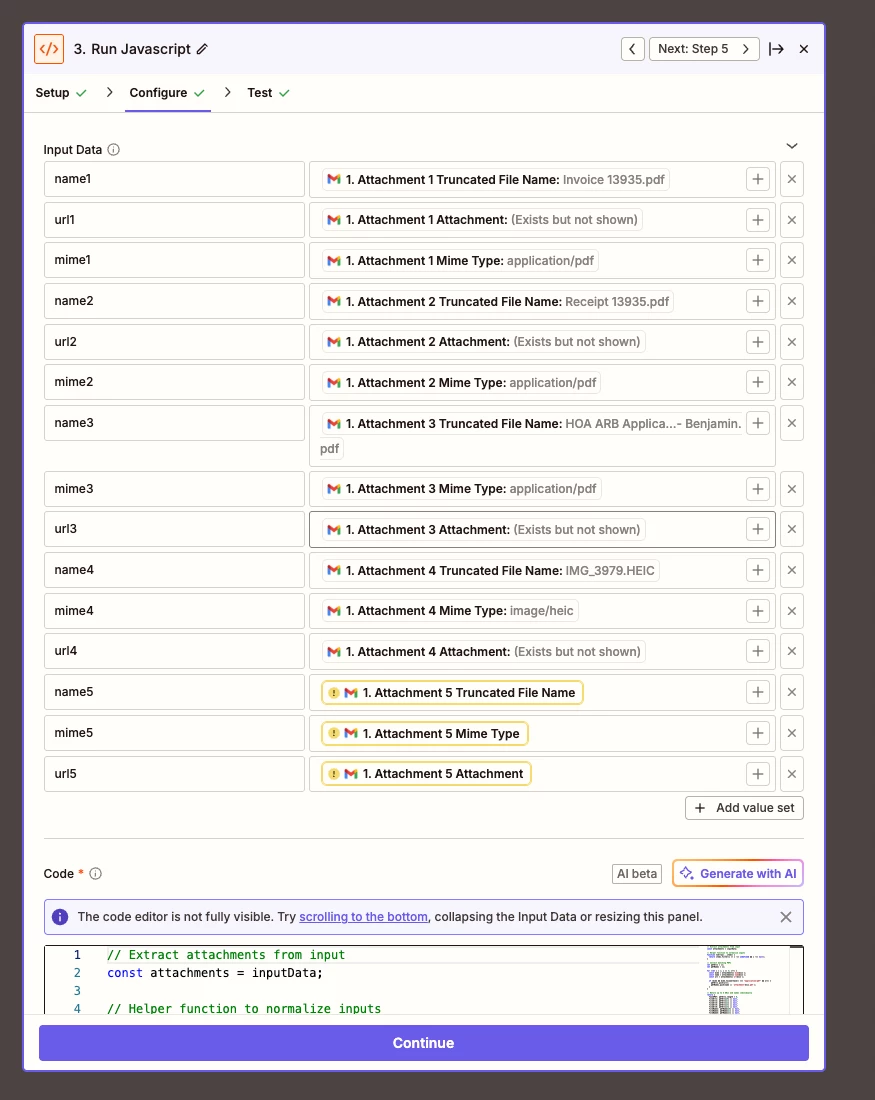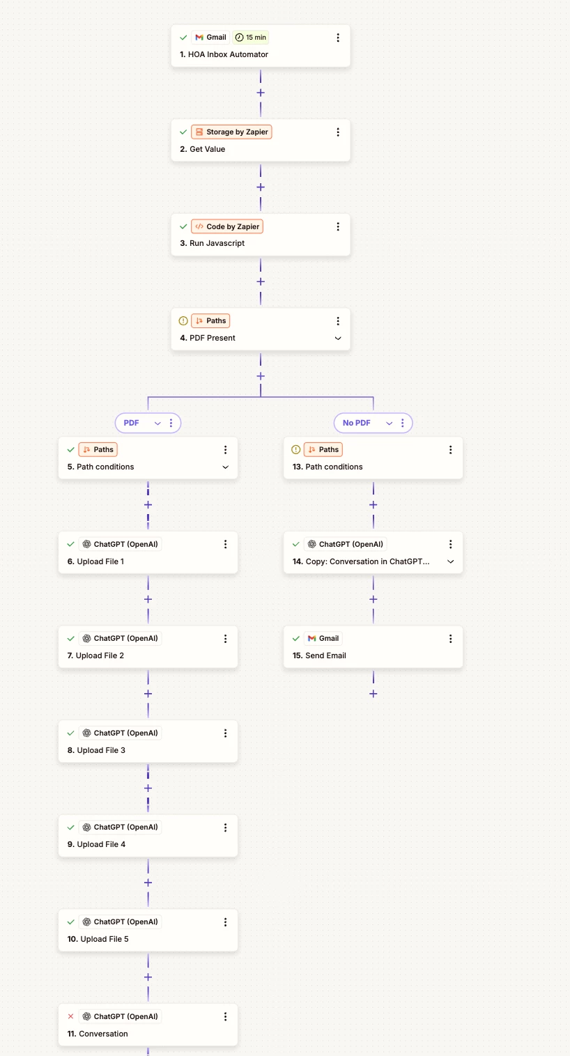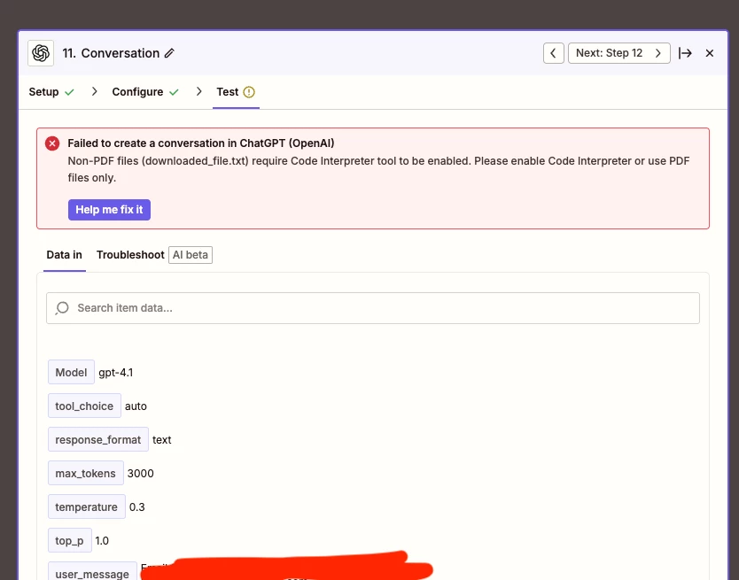Hi all – I’m running into an issue where my Zap attempts to upload email attachments (specifically PDFs) from Gmail, filter them using MIME type in a code step, and pass only the valid PDFs into the “Upload File” and “Conversation” steps for ChatGPT.