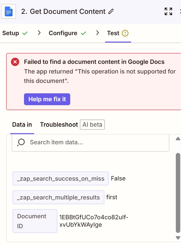 You probably want to add a Filter as Zap step 2 to only filter for file types that are supported for getting content from. (e.g. GDocs vs Images)
