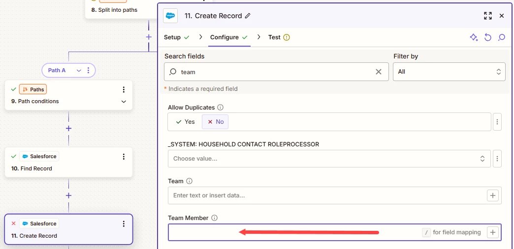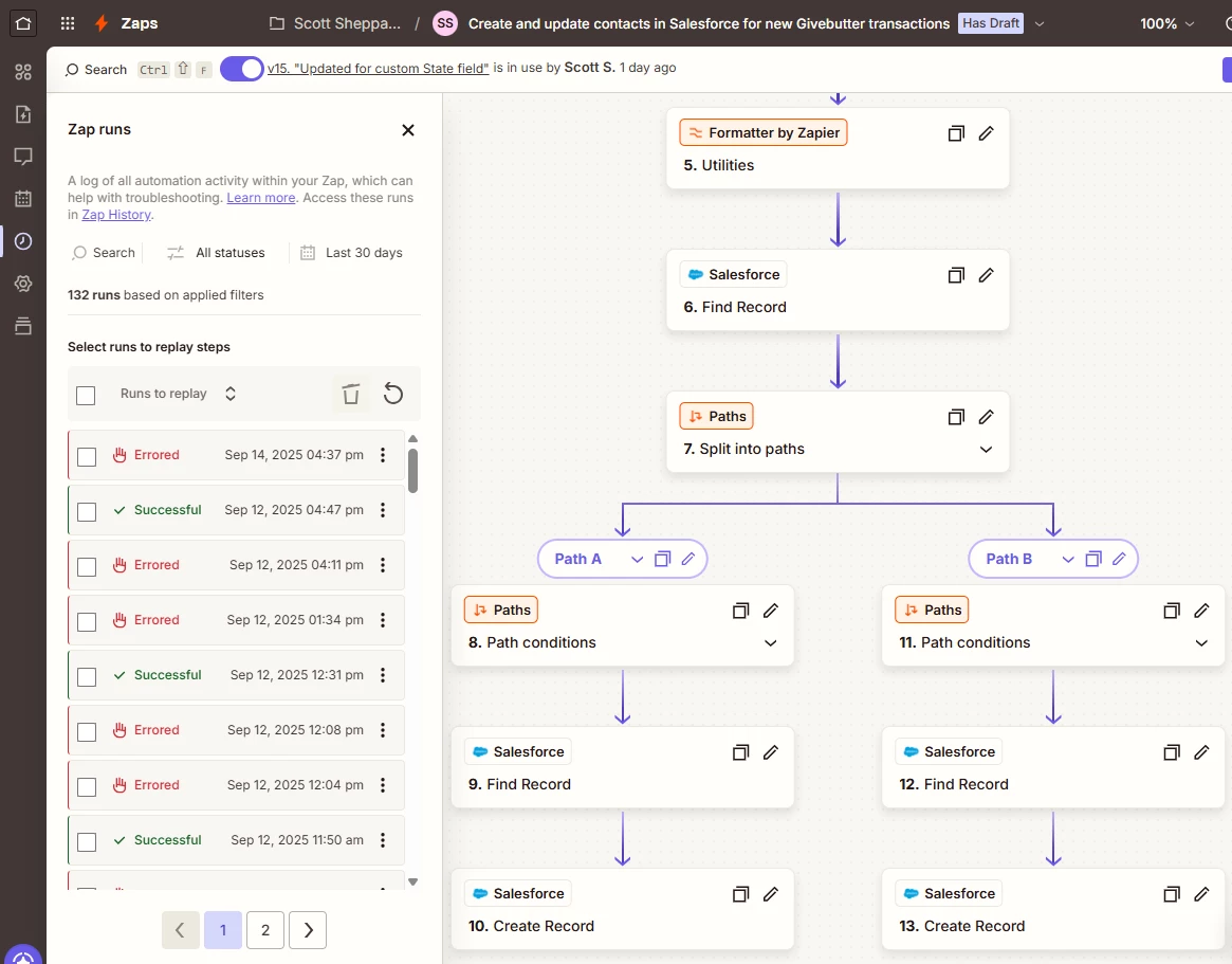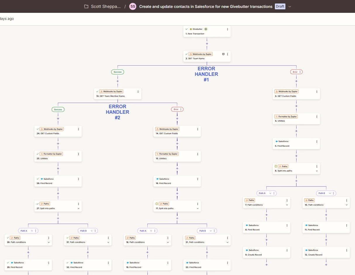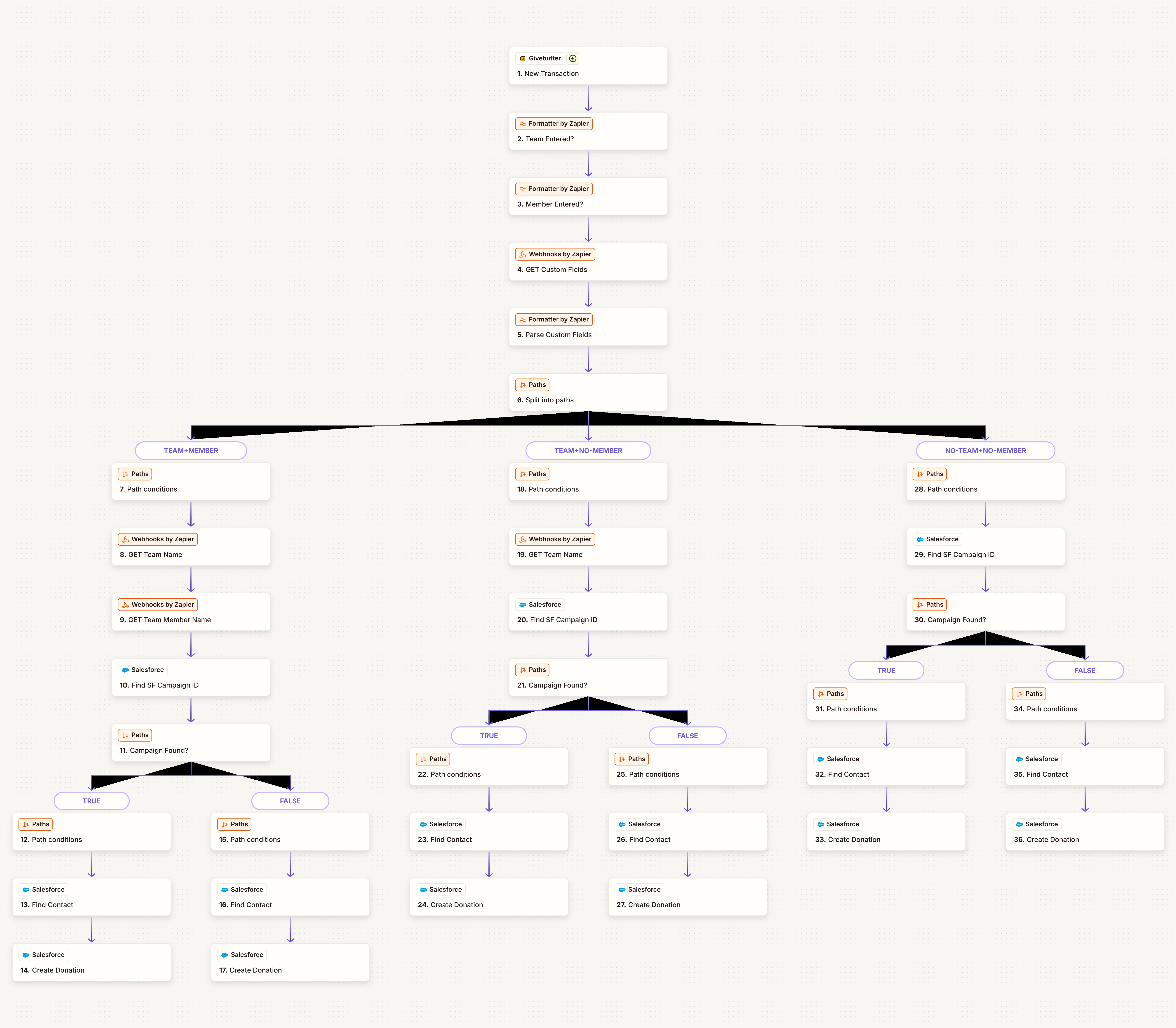 Because the transaction comes from Givebutter with TeamID and TeamMemberID, but not the names, I had to use webhooks to go get the Team Name and the Team Member Name. When TeamMemberID was blank I’d end up with a 414 error in a following step. So, by splitting into 3 paths -- Team+Member, Team+NoMember, and NoTeam+NoMember, I was able to only run the webhooks that would be successful, then further down, only fill the Salesforce donation fields that I had valid data for.