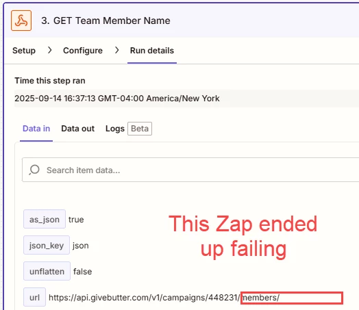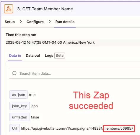 // Prepare the output object with the appropriate values output = { TeamID: teamID, MemberID: memberID }; ...which should substitute “000000” if TeamID or MemberID have no data coming from Givebutter.