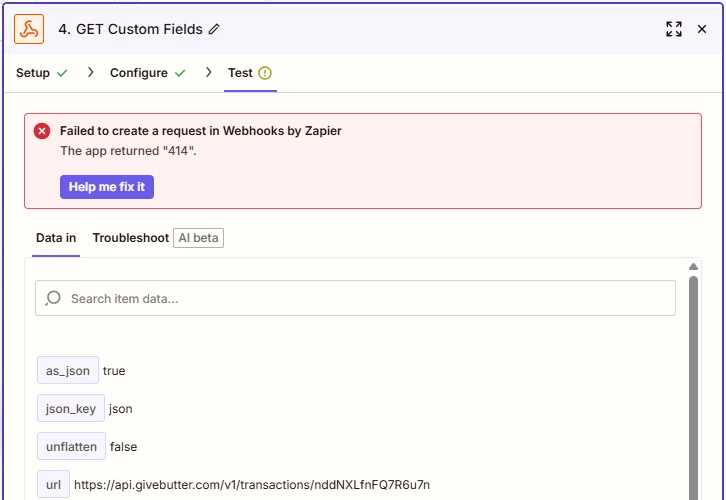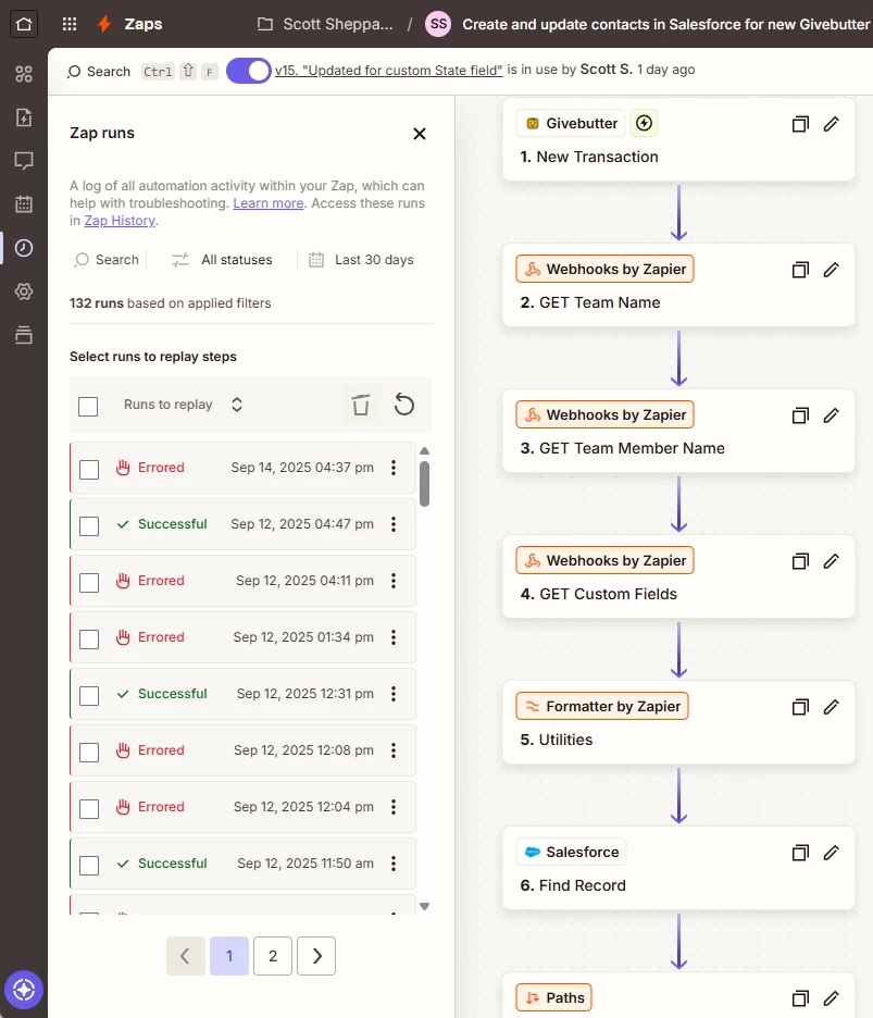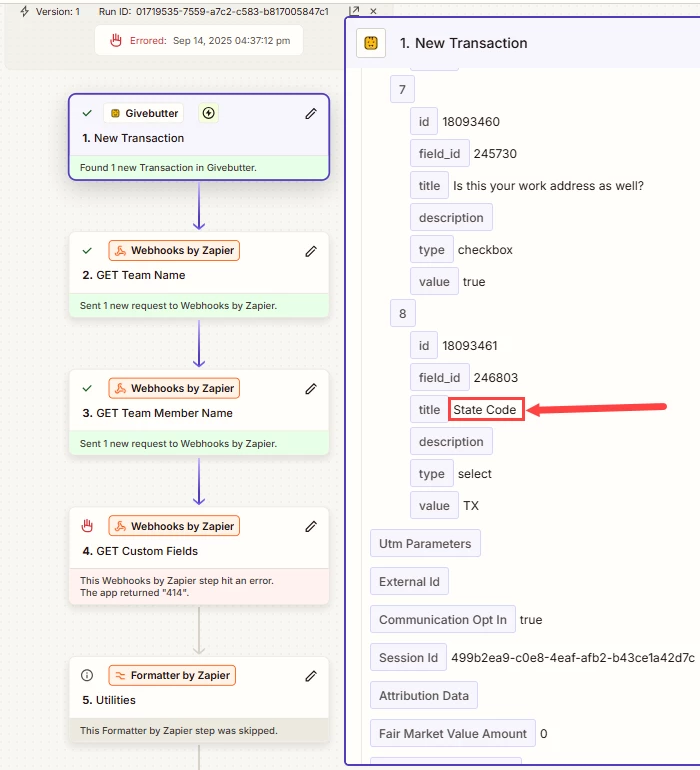After setting up a few custom fields in Givebutter, a few of which would combine for an Address type field in Salesforce, I found that when a user would spell out the state name, i.e. "Florida" instead of "FL", the Zap would fail. So, as I could not change a field type in Givebutter, I created a new drop-down field (with the 50 state codes) and archived the original text field. A few transactions failed on the Get Custom Fields webhook step and I can't get them to re-run successfully.