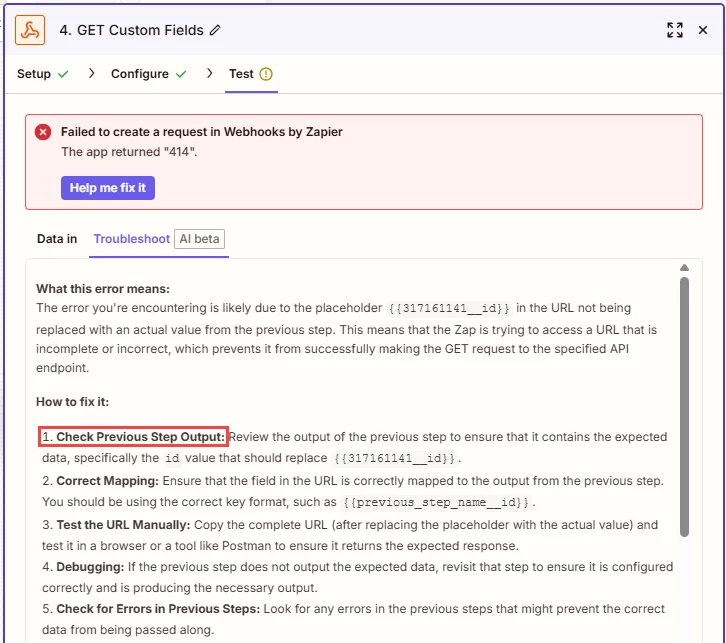 ...but after further reflection and digging, and noticing the “Check previous step output” on the troubleshooting tab, and looking at the data records that failed and continue to fail, I believe when there is no Team Member ID for webhook in step 3, step 4 ends up with a 414 error.