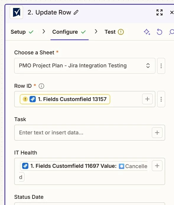 I am trying to get this Zap to test from Jira to Smartsheet but the test is blocked on the Smartsheet step because it is not detecting any value for customfield_13157 (Smarsheet Row ID) in Jira. Is there a way to search for the value that's in the field like how the other fields are showing a result? I am unsure why it is not grabbing it from Jira when the field is not empty in Jira.