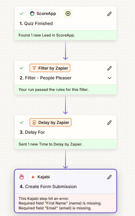 I have a quiz in scoreapp with 4 outcomes. In zapier I have created a zap for each one to try and keep the flow simple. They worked in testing but in live they are not pulling the data through.